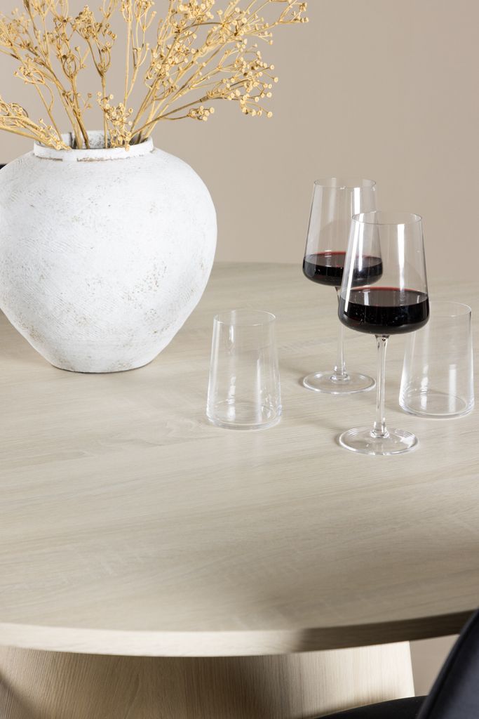 Lanzo Matbord: Tillverkat av vitvättad MDF, detta ljusa och fräscha bord på 120 cm i diameter erbjuder gott om plats för både mat och samtal. Den runda formen bidrar till en balanserad och social miljö, medan den robusta konstruktionen säkerställer stabilitet och hållbarhet.