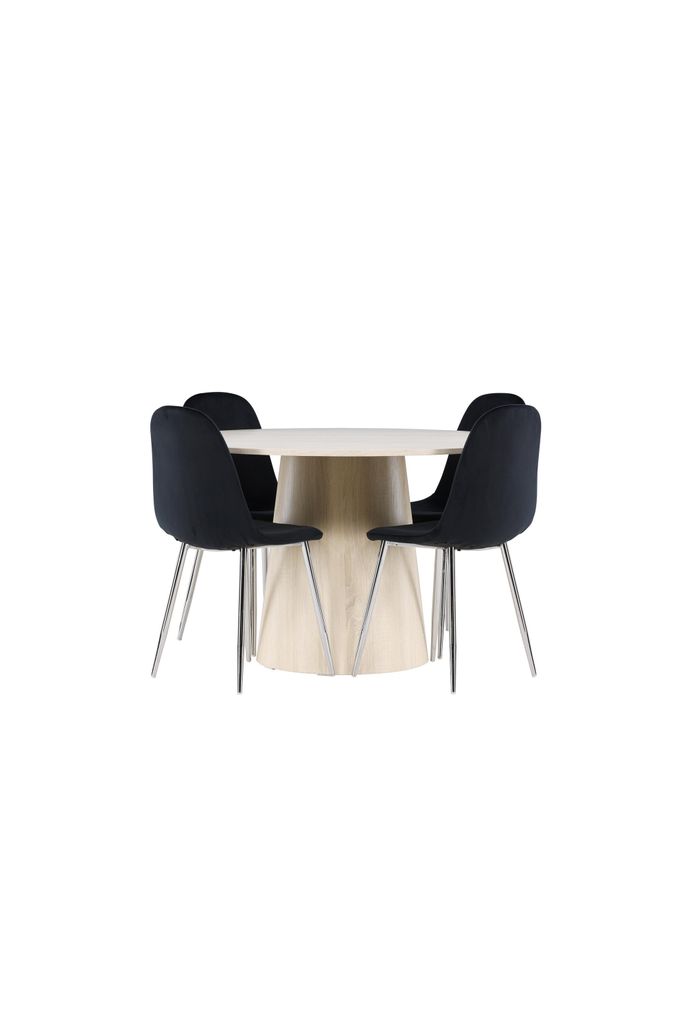 Modern matgrupp med Lanzo bord i vitvättad MDF och Polar-stolar i svart sammet. Perfekt för eleganta middagar.