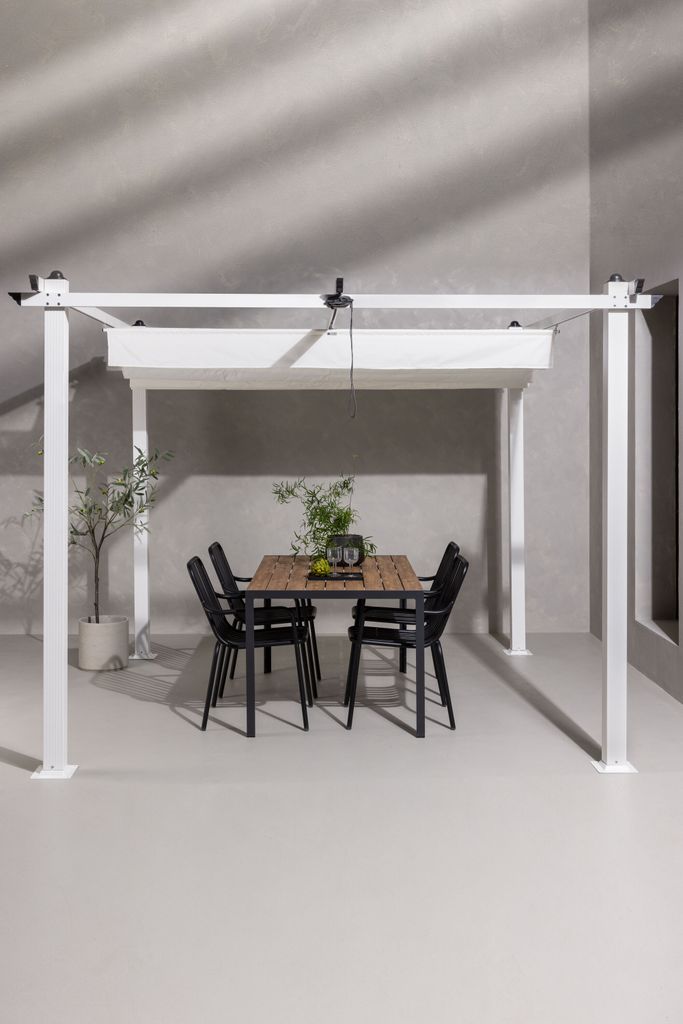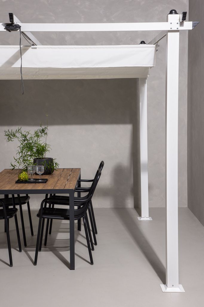 Den eleganta designen och den vita färgen matchar enkelt med olika typer av utemöbler. Pergolans ram i aluminium garanterar hållbarhet och stabilitet, medan takdelen i polyester ger ett smidigt skydd mot solen. När den inte används kan den enkelt plockas ner och förvaras torrt och skyddat.