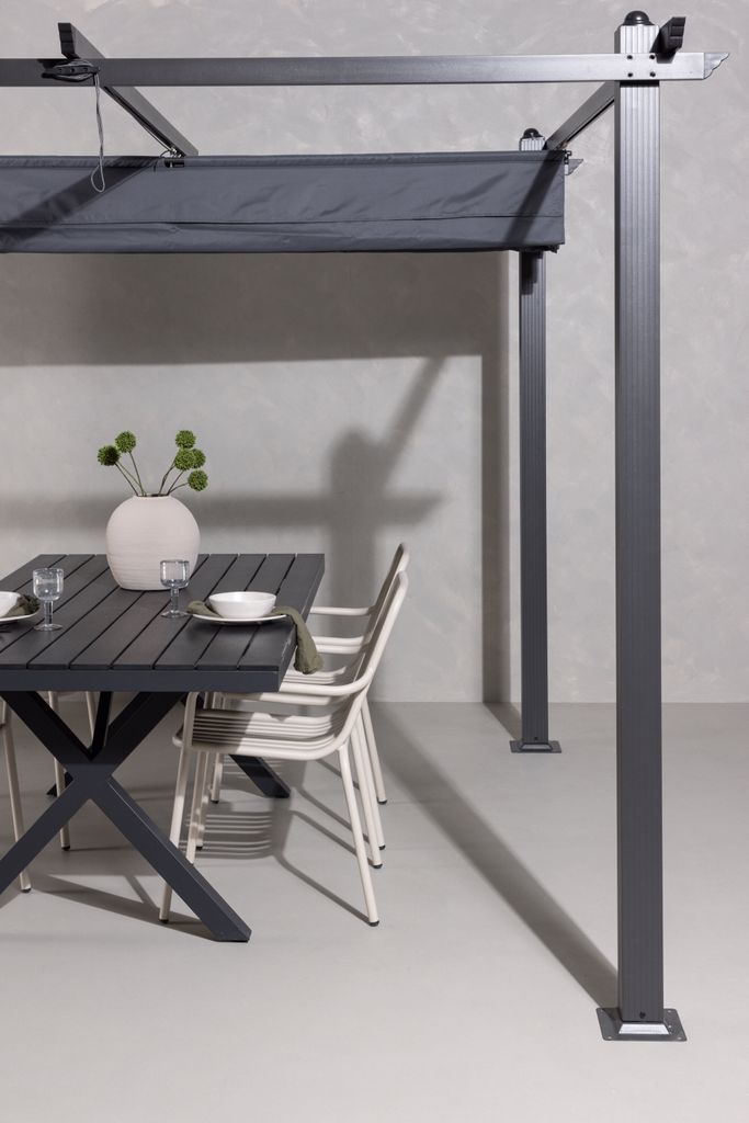 Upptäck Venture Home Lazio Pergola, din nya favoritplats för sommarens alla tillfällen. Med en stilren aluminiumstomme och ett tak av högkvalitativ polyester, ger Lazio Pergola både skugga och stil till din uteplats. Dess grå kulör smälter vackert in i olika utomhusmiljöer, samtidigt som pergolans slanka design skapar en inbjudande atmosfär.