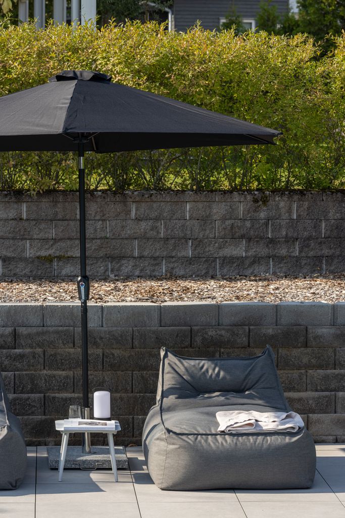 Leeds parasoll i svart med aluminiumstomme, ger stilrent skydd mot solen. Enkelt att fälla ut med vevlyft.