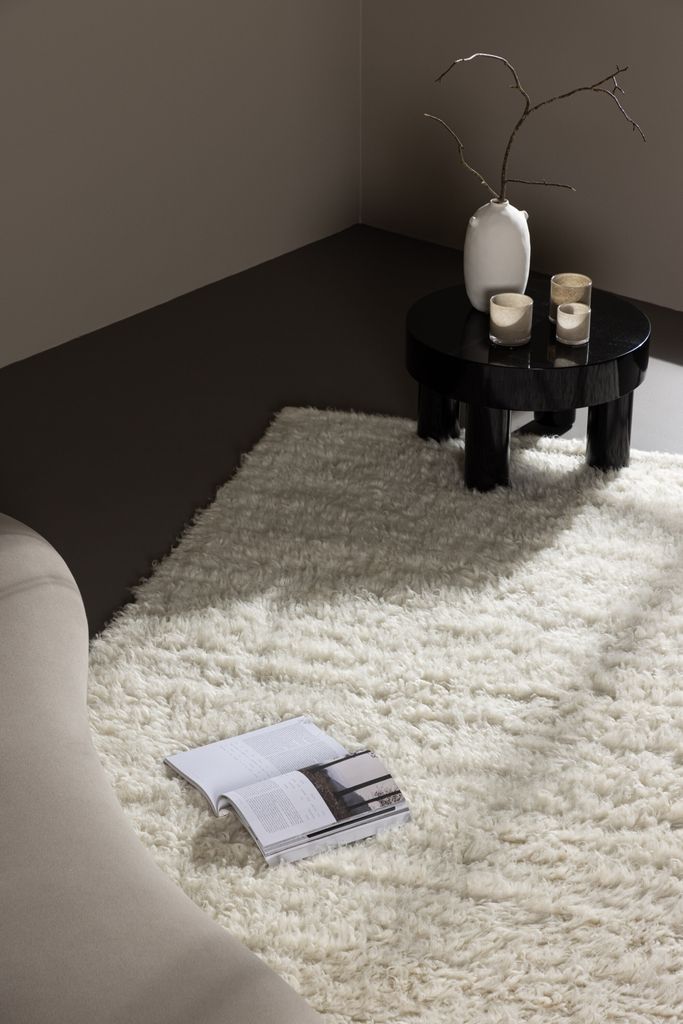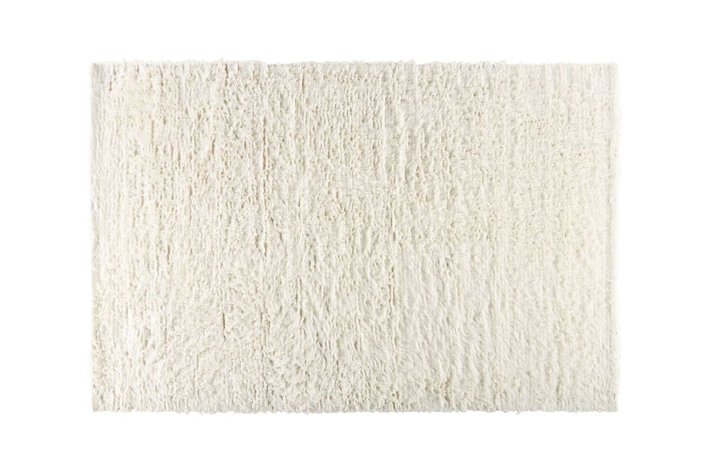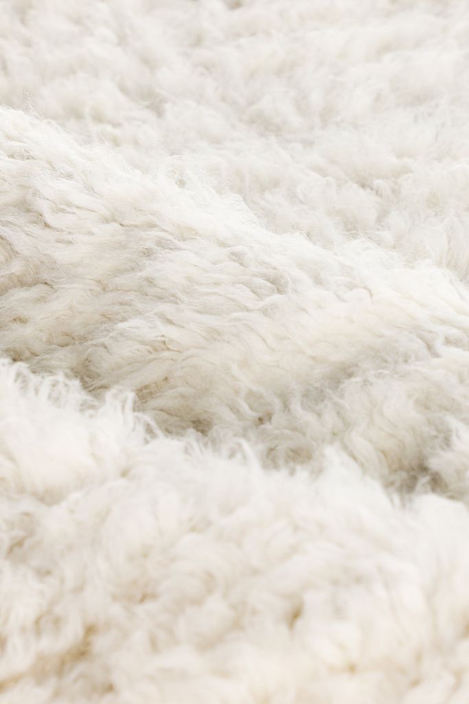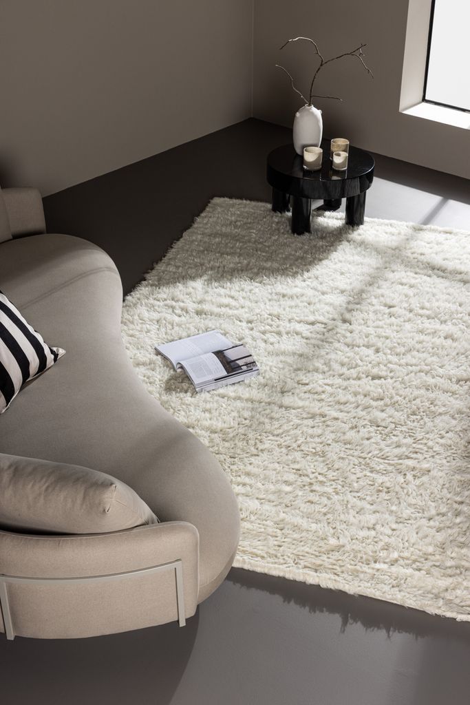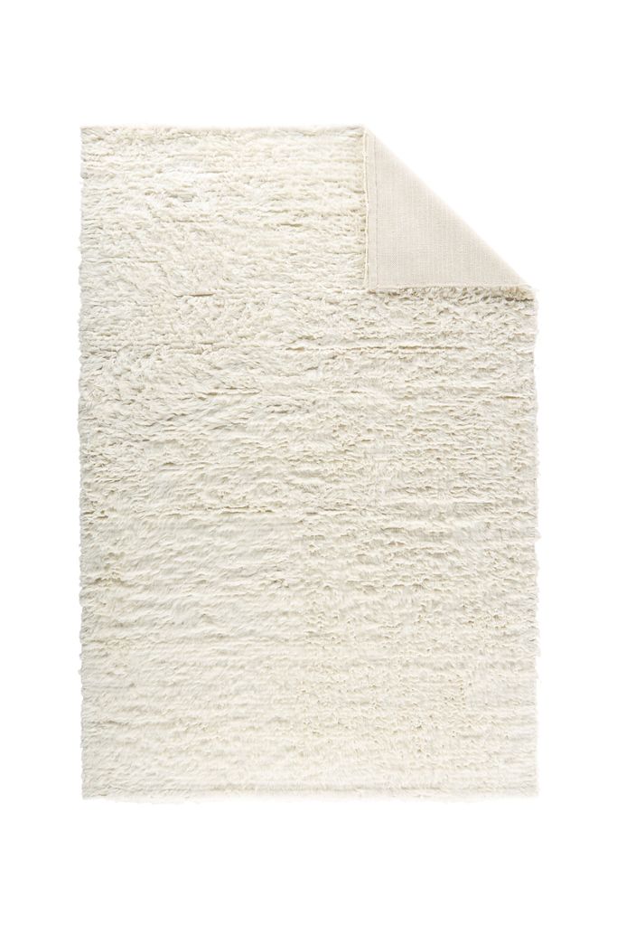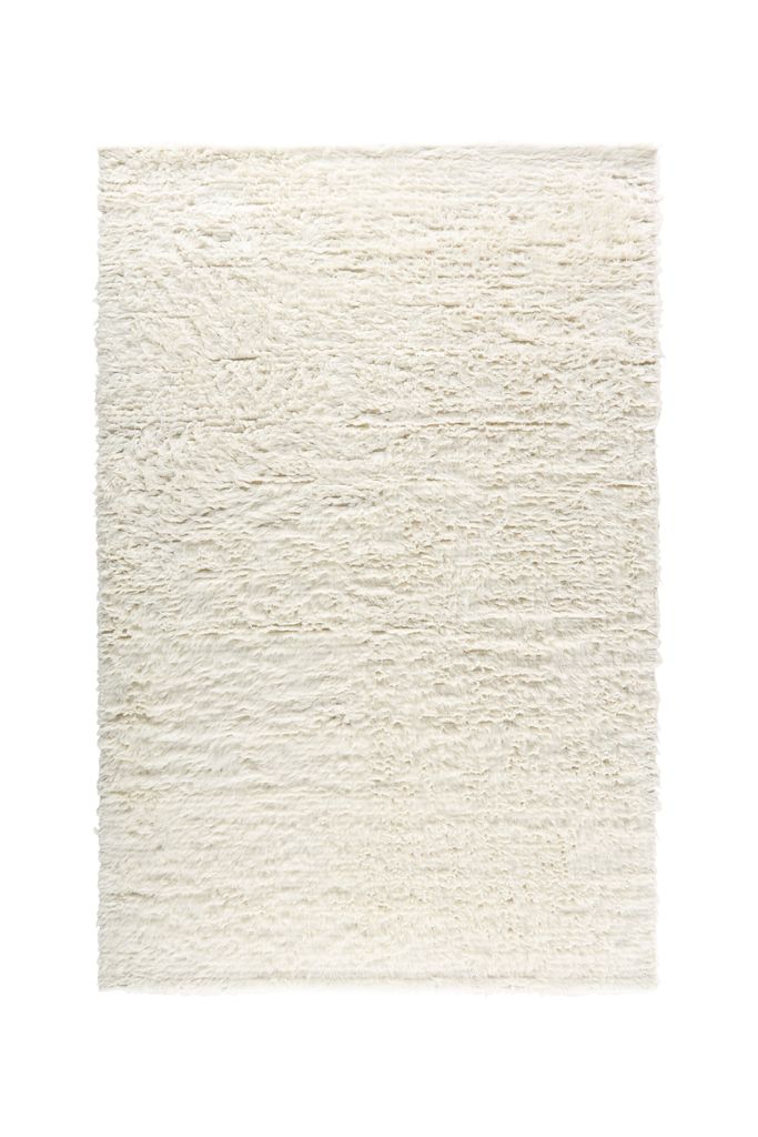 Mysig handvävd ullmatta i tidlös vit kulör med hög lugg för en varm atmosfär.