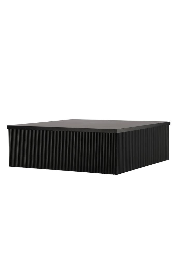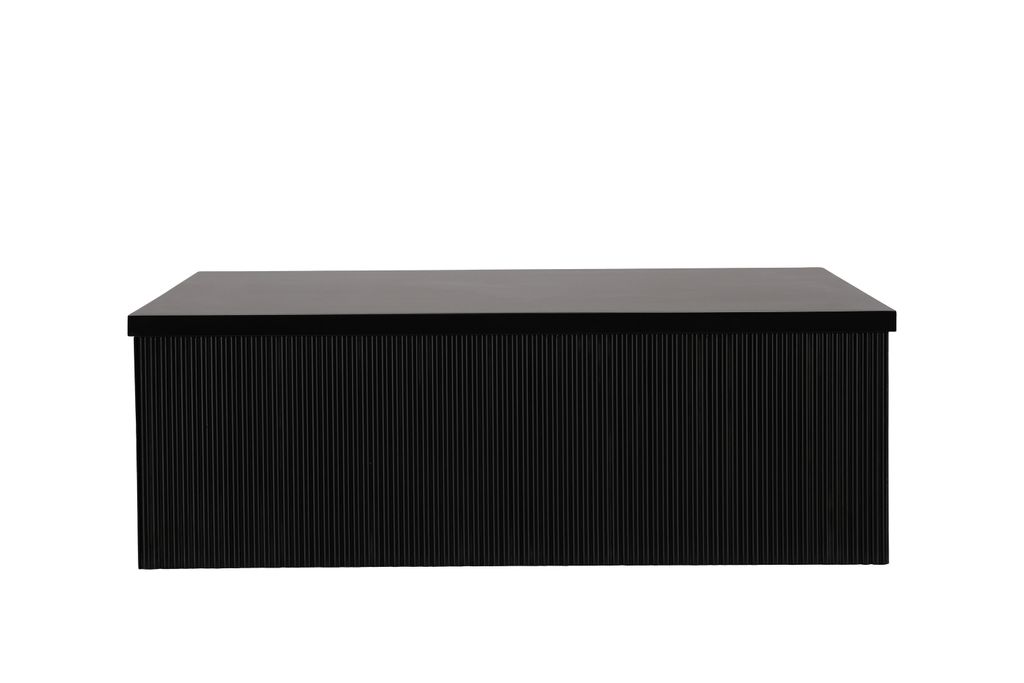 Stilrent och robust soffbord i svart MDF med ribbad design, perfekt för större soffor.