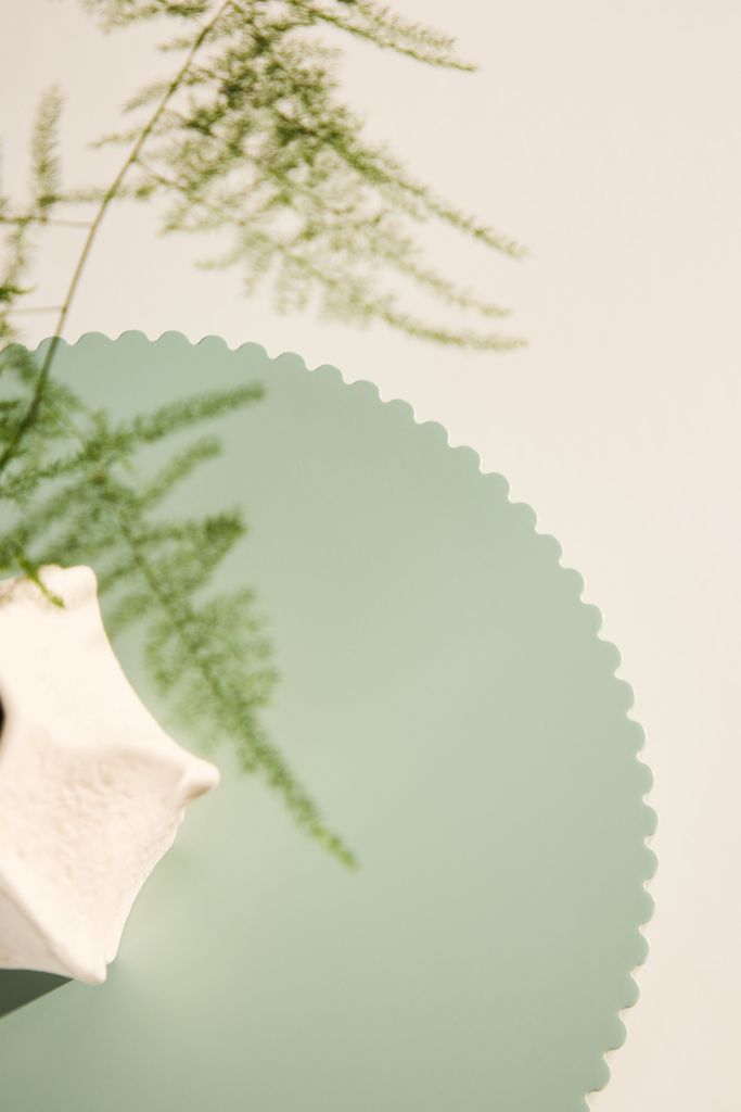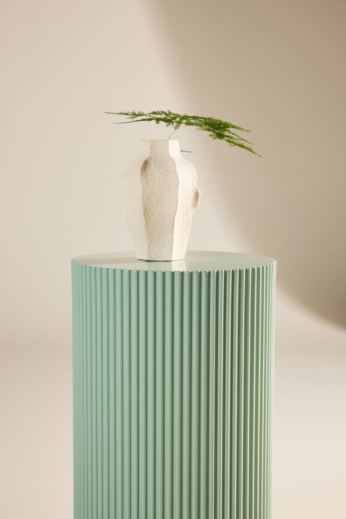 Den ljusa gröna färgen är både upplyftande och elegant, vilket gör bordet lätt att integrera i olika inredningsstilar. Den släta ovansidan skapar en harmonisk kontrast mot den strukturerade basen, perfekt för att visa upp dina favoritdekorationer, böcker eller en kopp kaffe.