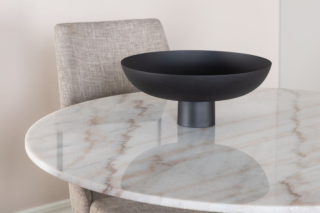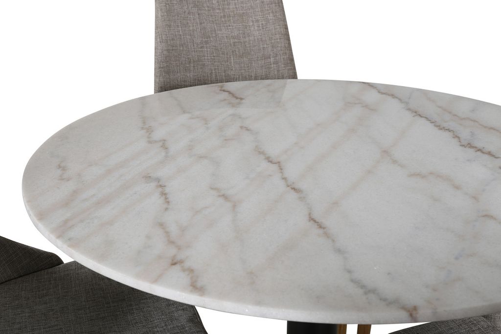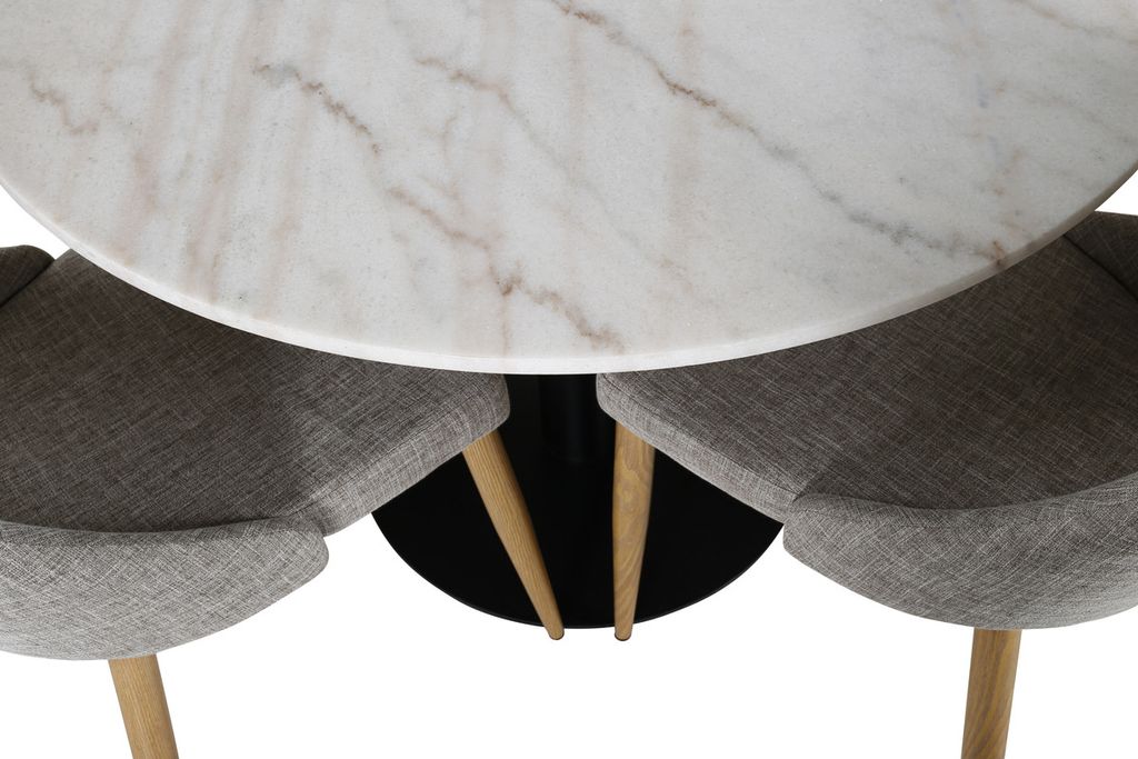 En matgrupp i modern och stilren design. Vårt runda matbord Estelle är både elegant och praktiskt. Bordet har en blank bordsskiva i vit, spräcklig marmor och ett cylinderformat underrede i svart metall. Här i perfekt match med stolar från serien Leone. Stolarna har en genomtänkt helklädd design som är enkel med ben i ek folierad metall och rygg/sits i grått polyestertyg med mjuk stoppning. Slipp kompromissa mellan komfort och blickfång!