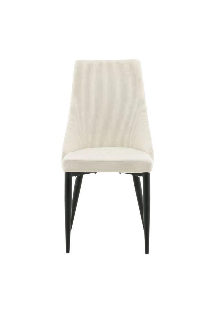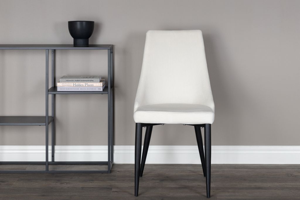 Trendig matstol i krämvitt manchestertyg med svart metallben. Perfekt för en gemytlig atmosfär.