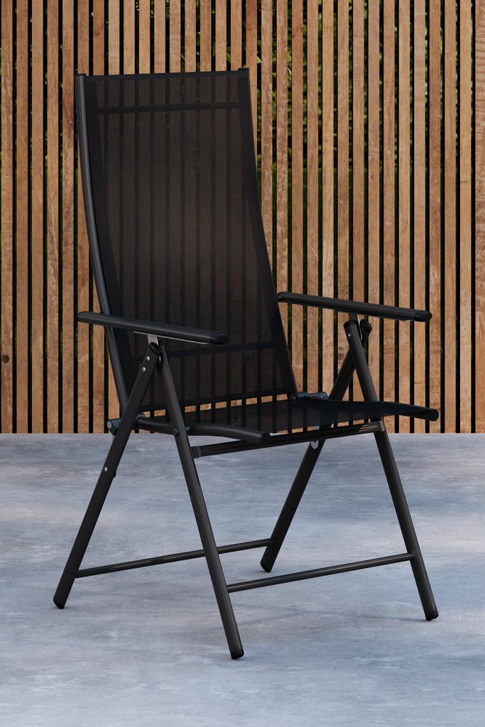 Levanzo matstol är en stilren och ihopfällbar stol i svart stål med justerbart ryggstöd för optimal komfort utomhus.