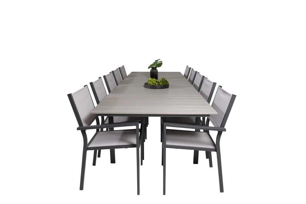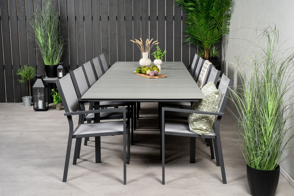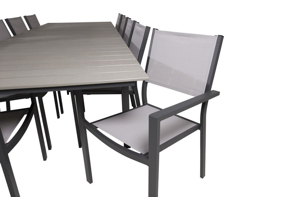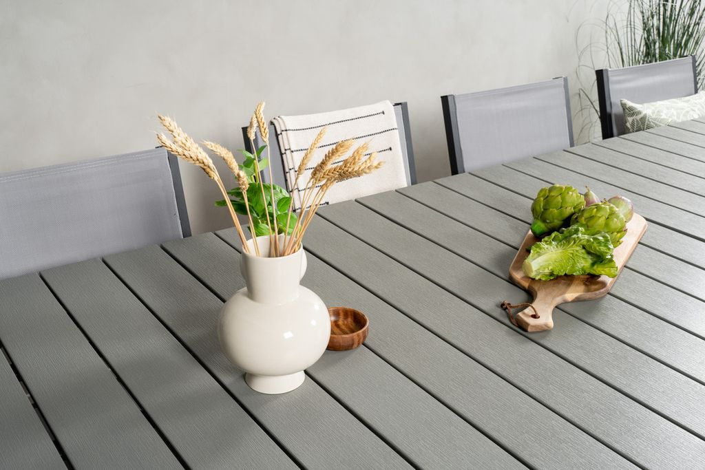 En läcker grå matgrupp i modern design! Matbord Levels i klassisk stil är både trendsäker och praktisk. Här tillsammans med sittvänliga och snygga matstolar i serien Copacabana. Samla familj och vänner och njut av varma sommarkvällar på uteplatsen!