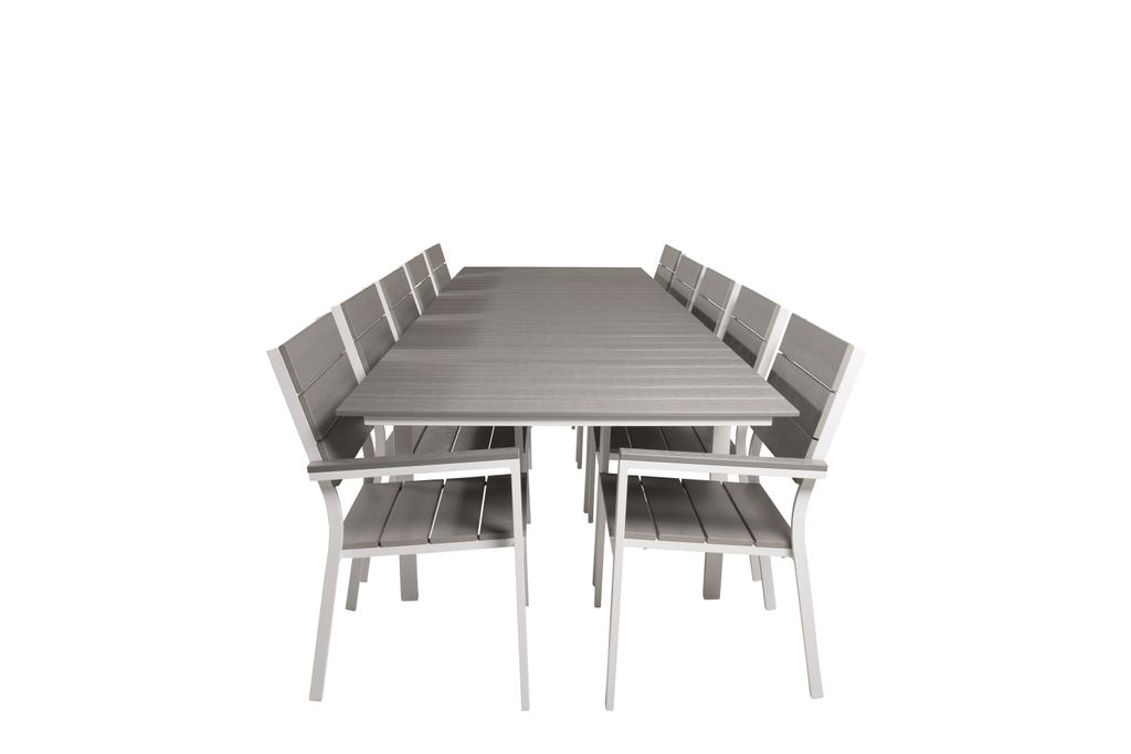 Trendsäker matgrupp i gråskala för somriga utomhusmiddagar. Perfekt för uteplatsen med stilrena stolar och rymligt bord.