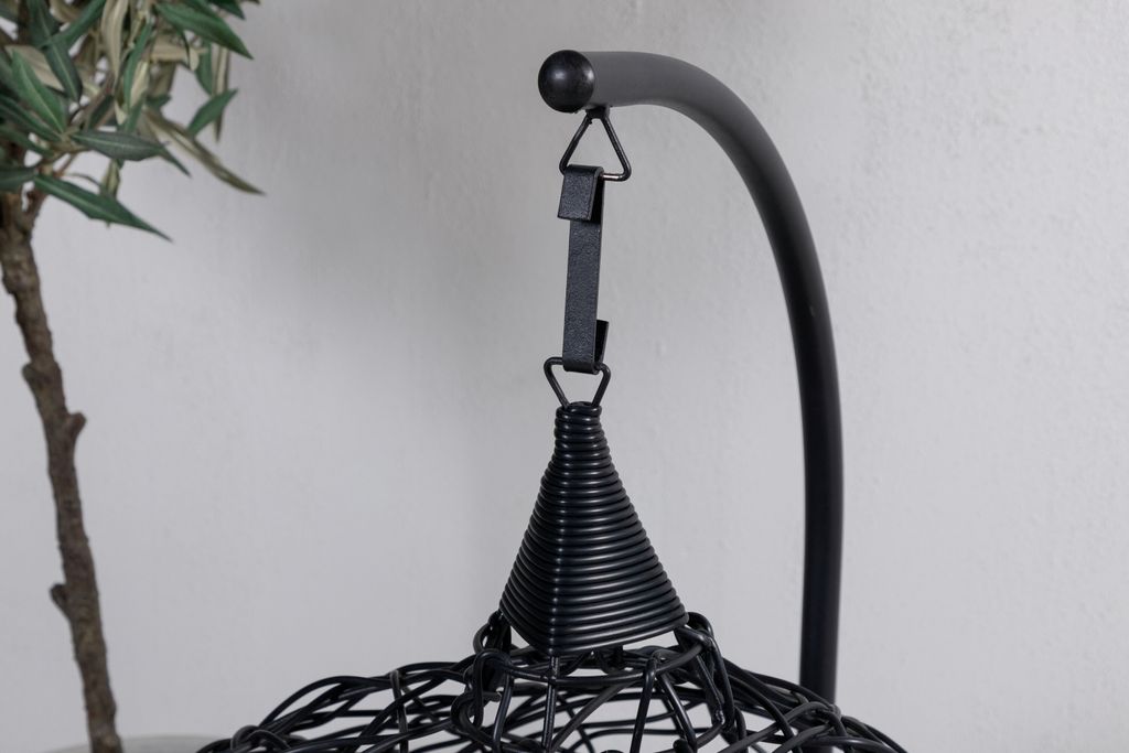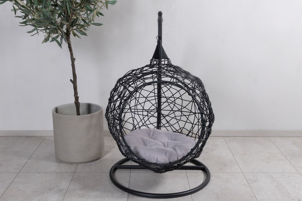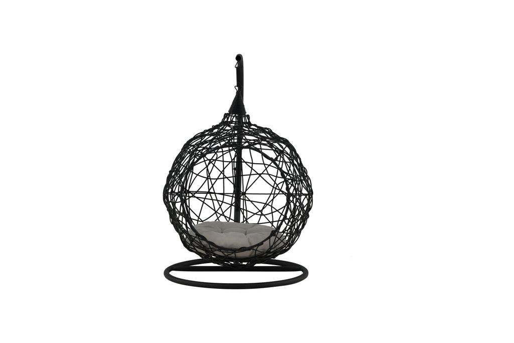 Hängstolen har en stilren rund design som enkelt kan placeras på uteplatsen eller i trädgården. Den svarta konstrottingen ger ett modernt intryck, medan den inkluderade dynan i grått skapar en mjuk och inbjudande känsla. Tack vare den stabila konstruktionen behövs ingen montering, bara häng upp och njut!