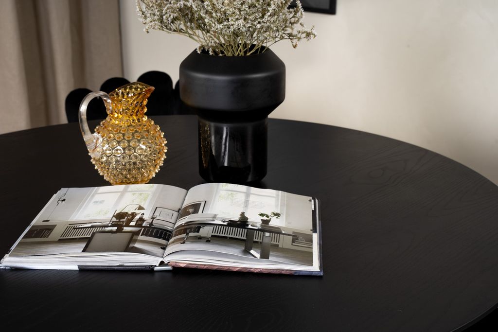 Matbord Dipp i svart med häftiga detlajer i form av guldfärgade benslut. Här tillsammans med svarta matstolar i serien Limhamn. Stolarnas unika ryggstöd ger matgruppen ett unikt och modern uttryck.