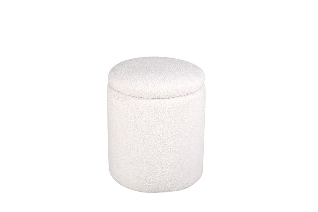 Elegant sittpuff i benvitt teddytyg med avtagbart lock, perfekt för förvaring och extra sittplats.