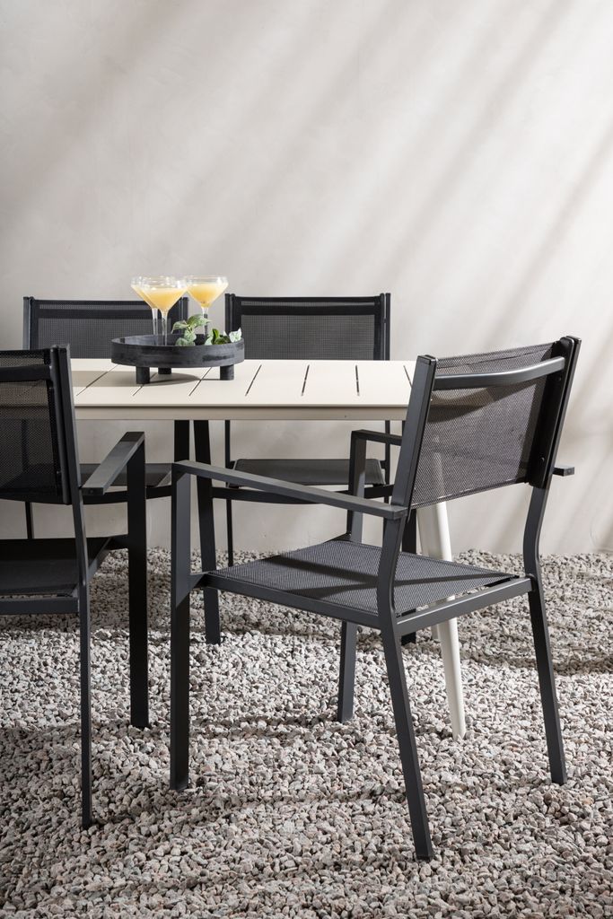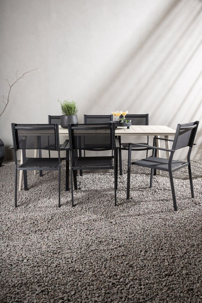 Tillsammans med bordet kommer matstolar från serien Copacabana, vilka erbjuder enastående komfort tack vare sina raka nordiska former och integrerade armstöd i aluminium. Stolarnas sits är tillverkad i slitstarkt svart textilene, vilket gör dem både hållbara och bekväma.