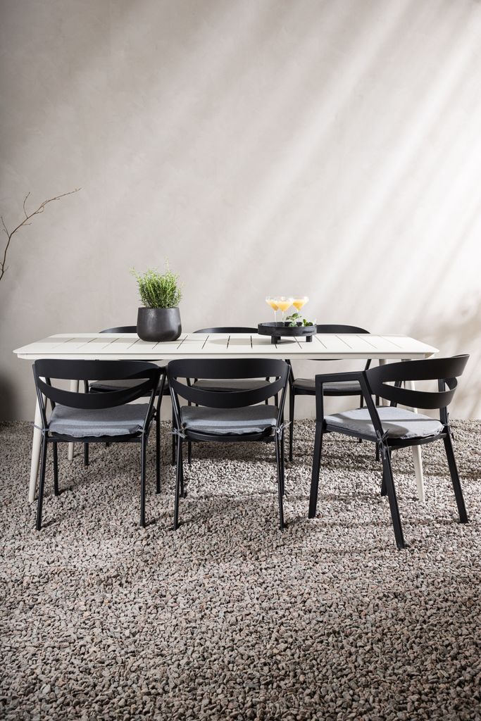 Matstolarna från serien Slit är tillverkade i svart aluminium och har integrerade armstöd för extra komfort. De grå dynorna kompletterar stolarna perfekt och erbjuder en bekväm sittupplevelse under långa middagar. Med mått på 200x90 cm är bordet idealiskt för både små och stora tillställningar.