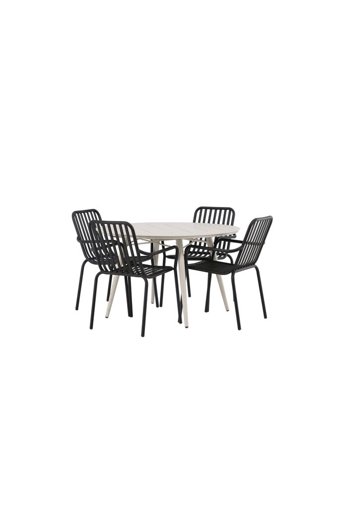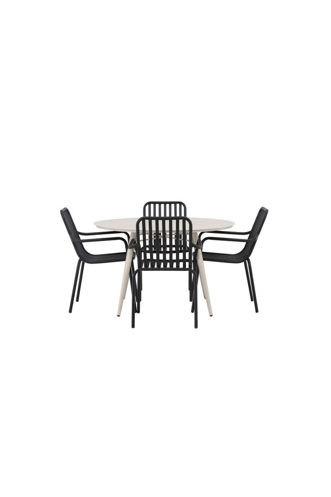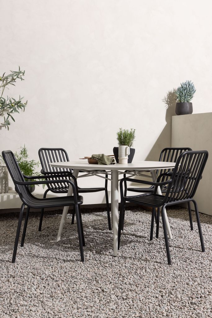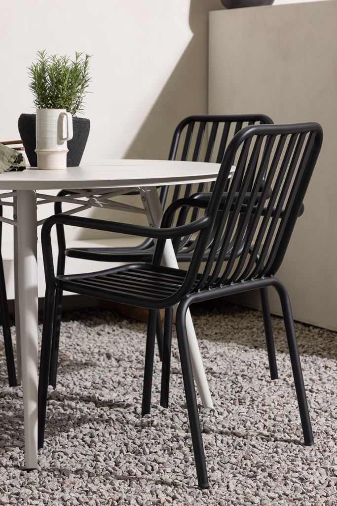 Matgruppen kompletteras av fyra stilrena stolar från serien Peking. Stolarnas ribbade design och sotigt svarta färg ger en känsla av modern elegans. Tillverkade i aluminium, dessa stolar är både lätta att flytta och hållbara. De integrerade armstöden ger extra komfort, vilket gör detta set perfekt för långa och njutbara måltider i goda vänners lag.