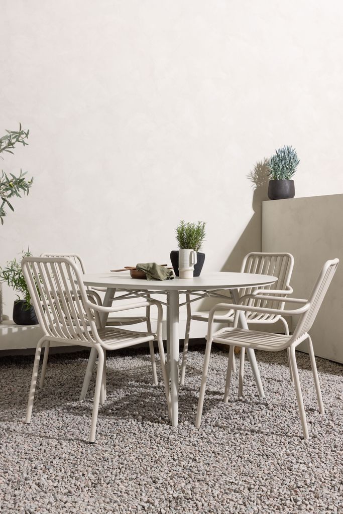 Möblera ditt uterum ljust och fräscht med vår Venture Home Lina Rund Matgrupp. Denna eleganta matgrupp består av ett stilrent och klassiskt designat runt bord med dekorativa springor på toppskivan och lätt utsvängda ben. Hela bordet är tillverkat i robust stål, vilket ger både stabilitet och en modern touch.