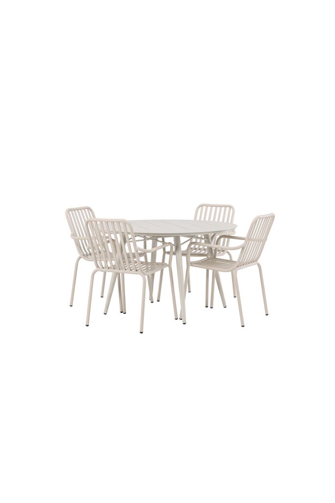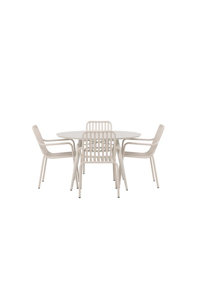 Denna matgrupp passar perfekt för uterummet eller trädgården, och är tillverkad för att stå emot väder och vind. Låt den varma beige färgen och den eleganta designen skapa en inbjudande atmosfär.