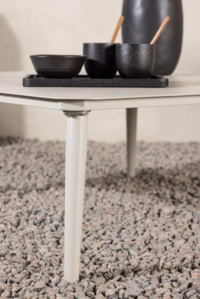 Soffbordet är tillverkat i högkvalitativ aluminium, vilket ger det enastående hållbarhet och motståndskraft mot väder och vind. Den vackra beige färgen bidrar till en känsla av elegans och harmoni och smälter smidigt in i din utomhusmiljö. De släta linjerna och den minimalistiska designen gör att det passar perfekt i trädgården, på uteplatsen eller terrassen.