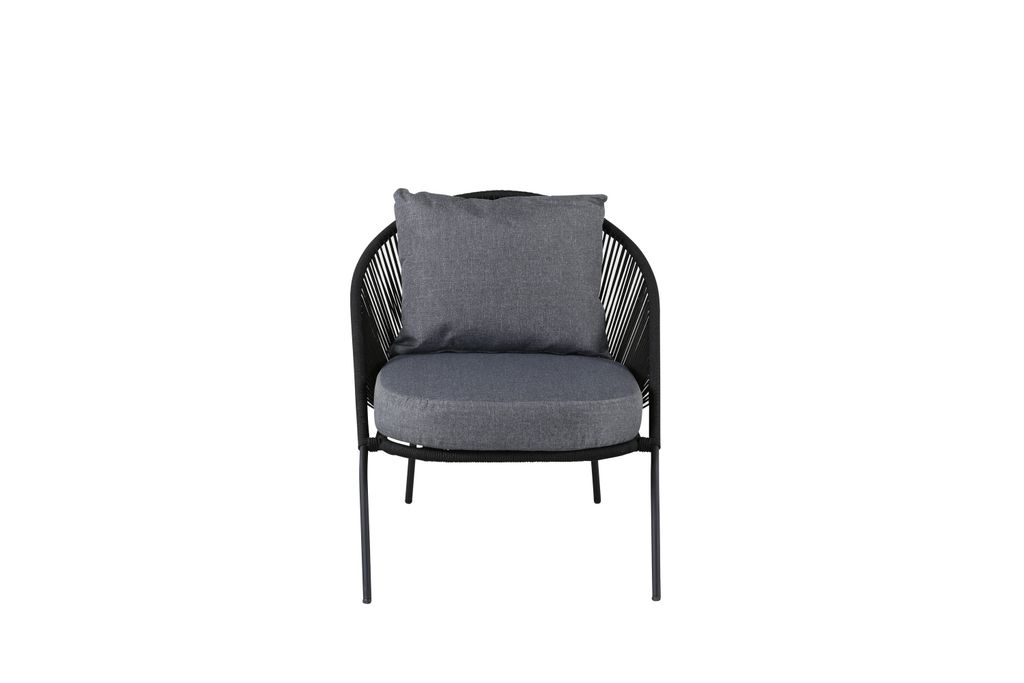 Elegant loungestol i svart aluminium och vävt rep. Komfort och stil för både klassiska och moderna miljöer.