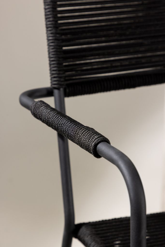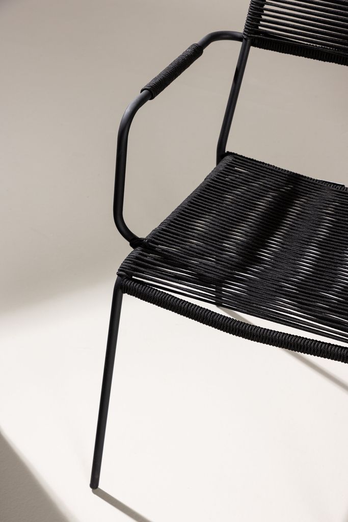 Möblera uteplatsen med moderna Lindos matstolar. Eleganta, stapelbara och tillverkade i svart aluminium och vävt rep.