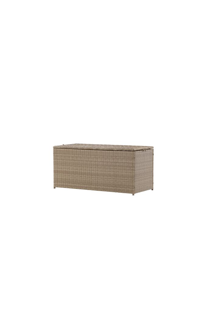 Naturfärgad dynbox i konstrotting för väderbeständig och snygg förvaring av utemöblernas dynor.
