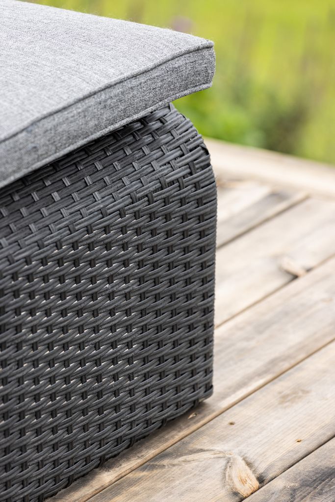 Den mörkgrå färgen tillsammans med de ljusa dynorna ger solsängen en modern och stilren estetik. Dessutom är solsängen tillverkad i hållbar rotting, vilket ger en naturlig känsla samtidigt som den är lättskött. Ramen av aluminium klädd i rotting ger inte bara stabilitet utan även en elegant touch.