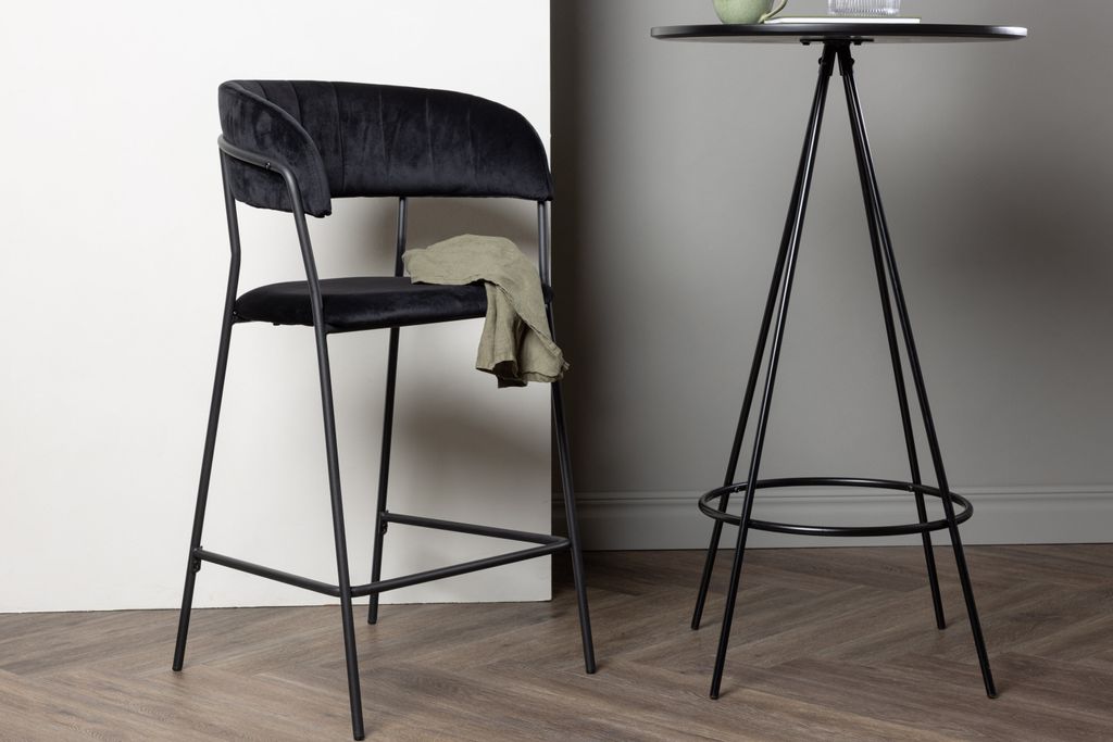 Elegant och bekväm barstol i svart sammet med stålben och fotstöd, perfekt för moderna hem.