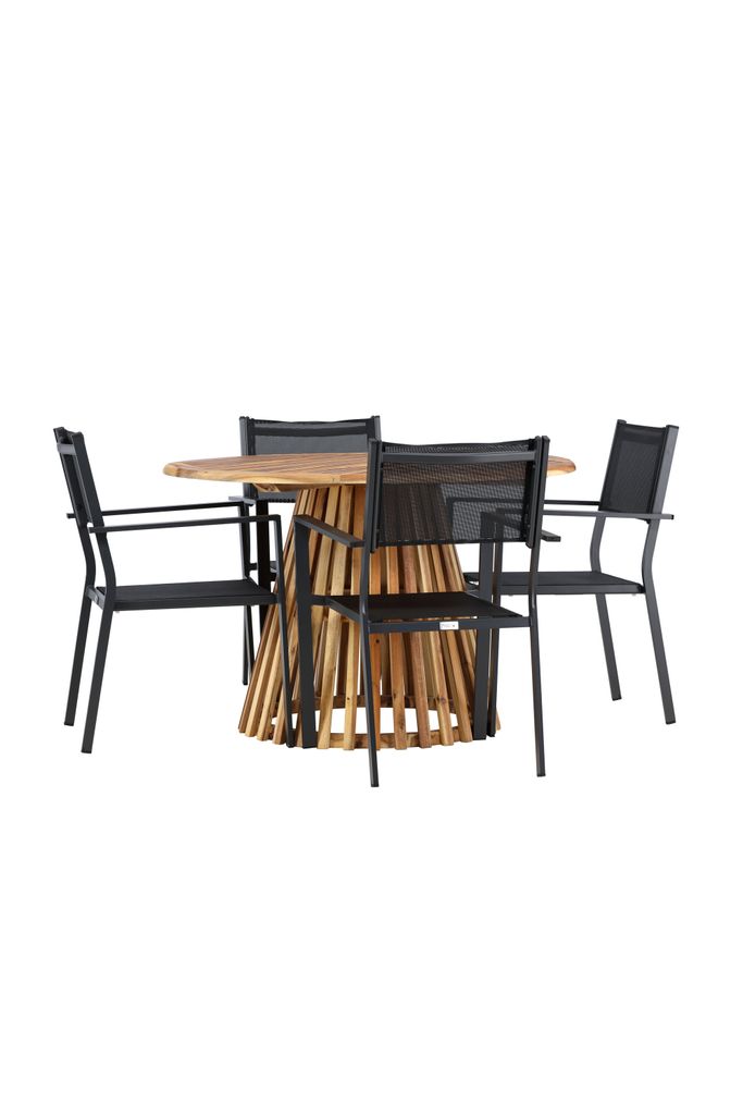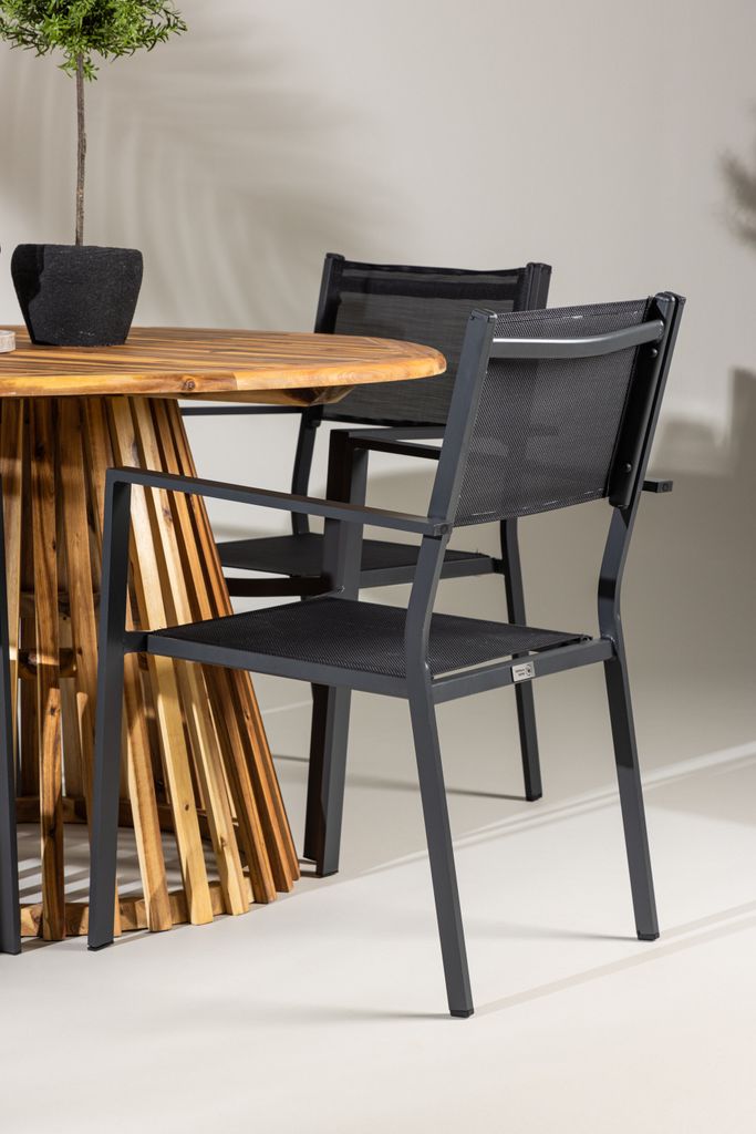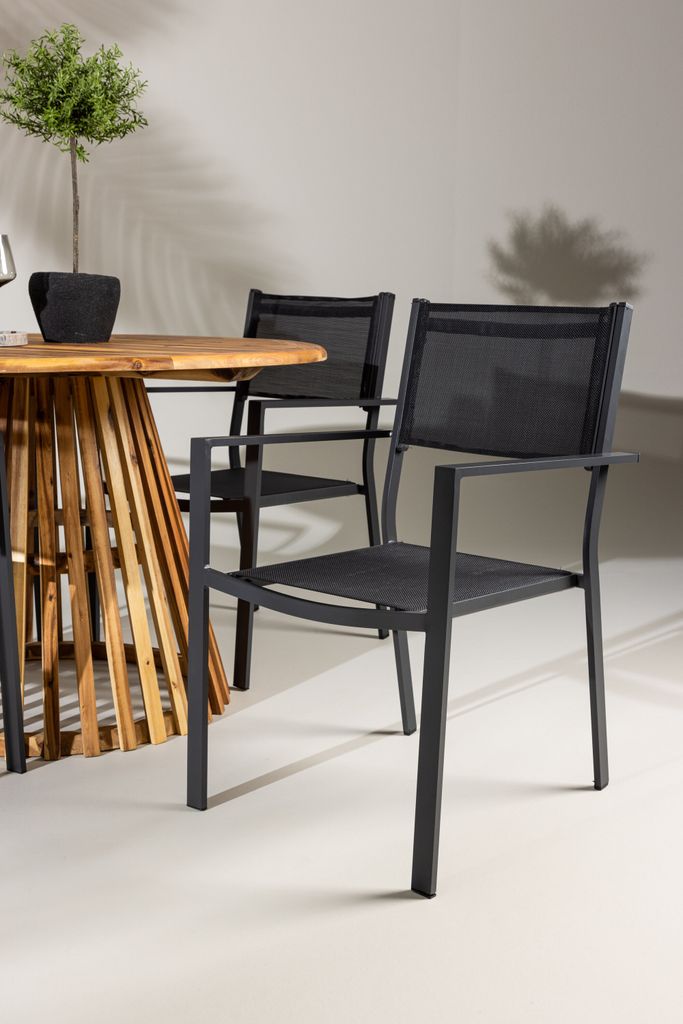 De fyra Copacabana-stolarna kompletterar bordet med sin moderna design och robusta aluminiumkonstruktion. Deras eleganta svarta färg ger en stilfull kontrast mot bordets naturliga trälook. Dessa stolar är inte bara visuellt tilltalande utan också bekväma, vilket gör dem idealiska för långa middagar och sociala stunder.