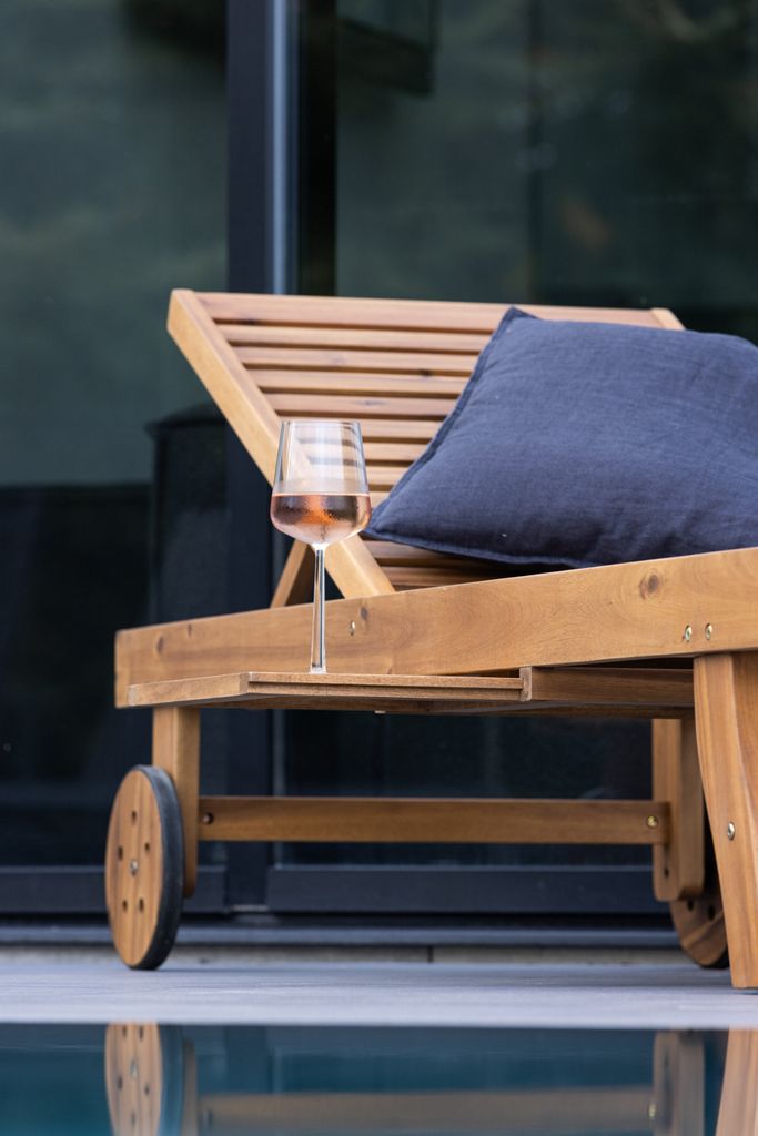Elegant solstol i slitstark acacia med hjul och justerbart ryggstöd. Perfekt för avkoppling utomhus.