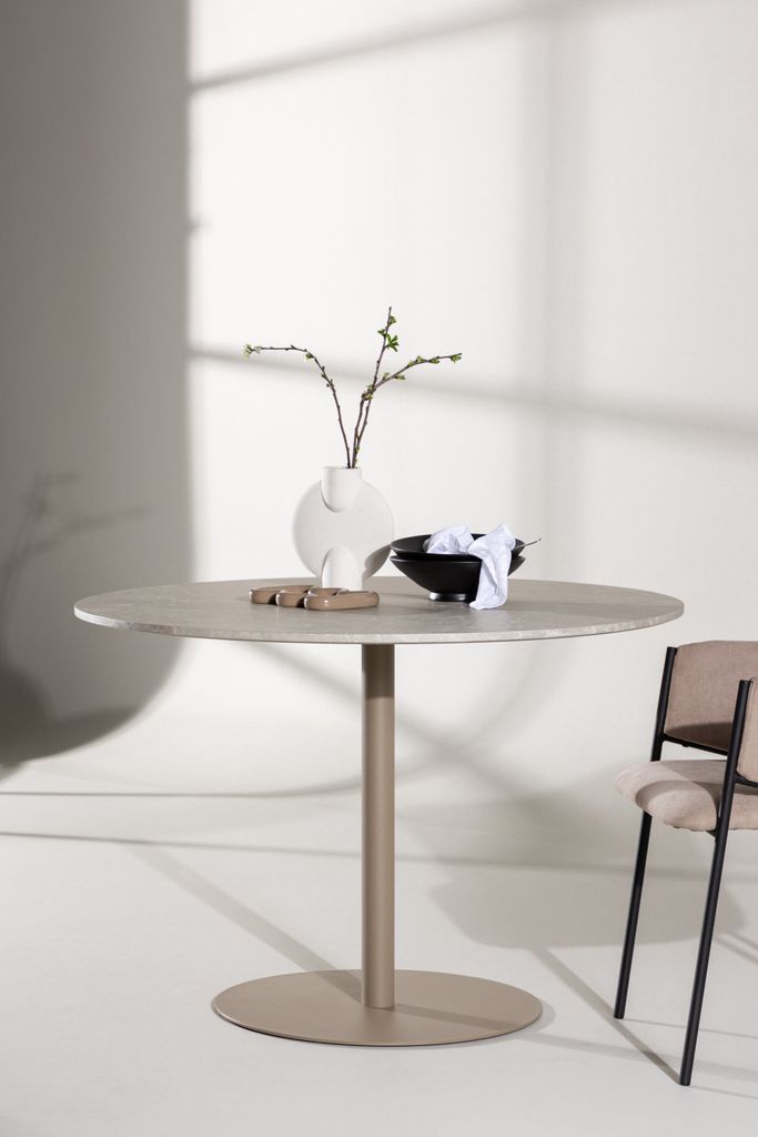 Stilrent matbord med marmorimitation i beige MDF, perfekt för moderna hem. Diameter 110 cm.