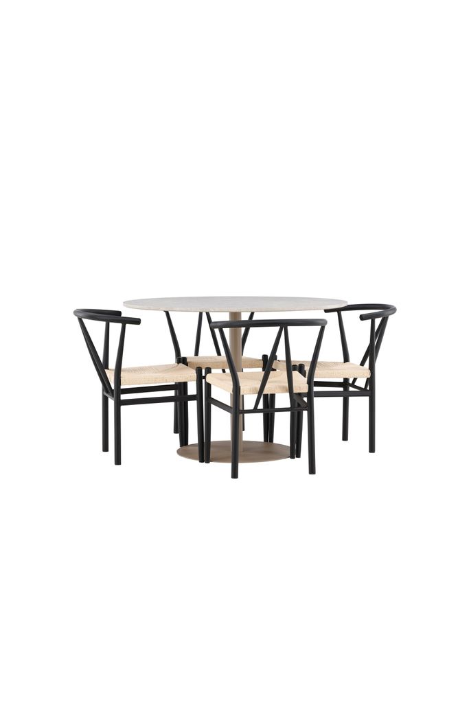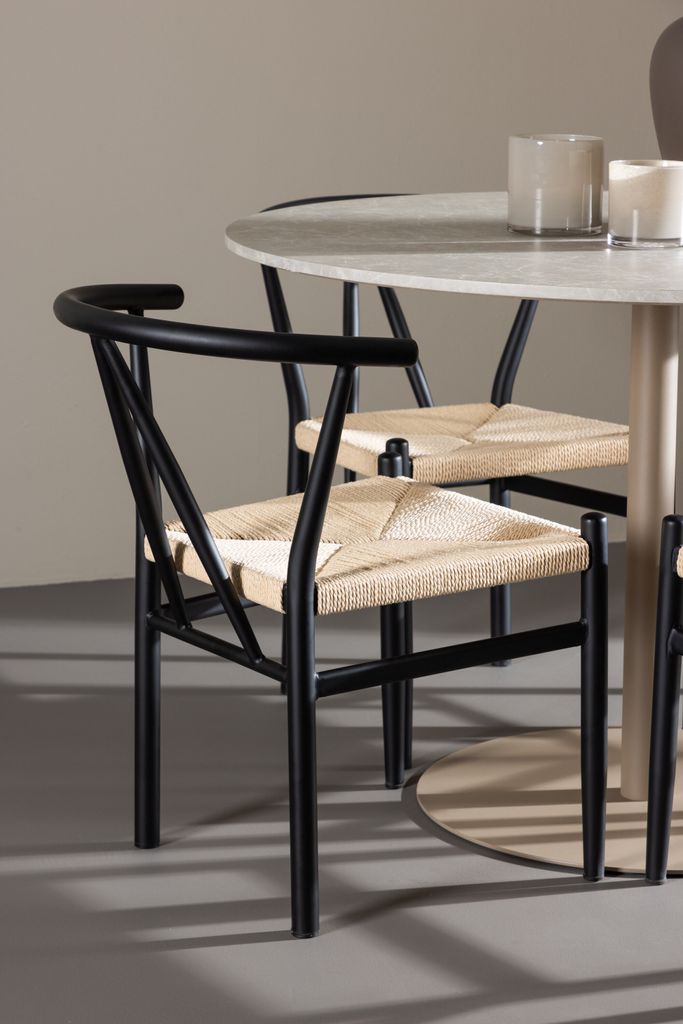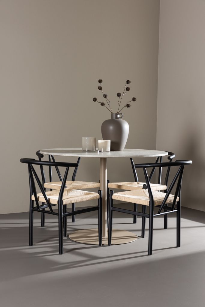 De fyra medföljande Alfons-stolarna kompletterar bordet på ett utmärkt sätt. Stolarna har svarta ben i metall som ger en stabil konstruktion, medan sitsen i beige rotting skapar en inbjudande och naturlig sittupplevelse. Rottingens unika struktur och komfort gör att du och dina gäster kan sitta bekvämt under långa måltider och samtal. Kombinationen av de svarta benen och den beige rottingen ger stolarna ett modernt och stilrent utseende som harmoniserar perfekt med bordet Lycke.