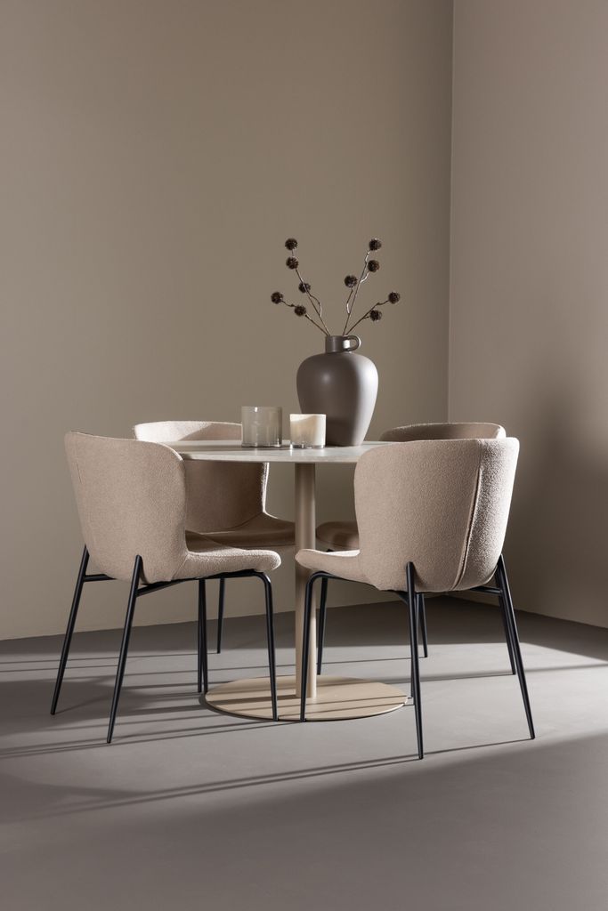 De fyra Modesto-stolarna kompletterar bordet perfekt med sina eleganta sitsar klädda i vit boucle och stilrena svarta ben. Dessa stolar erbjuder både komfort och stil, vilket gör dem idealiska för långa, njutbara middagar med familj och vänner. Deras moderna design med hög ryggstöd och mjuka sitsar ger ditt matrum en sofistikerad och samtida touch.