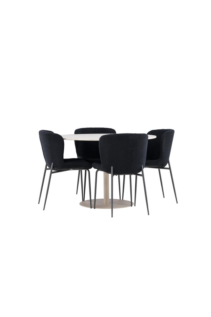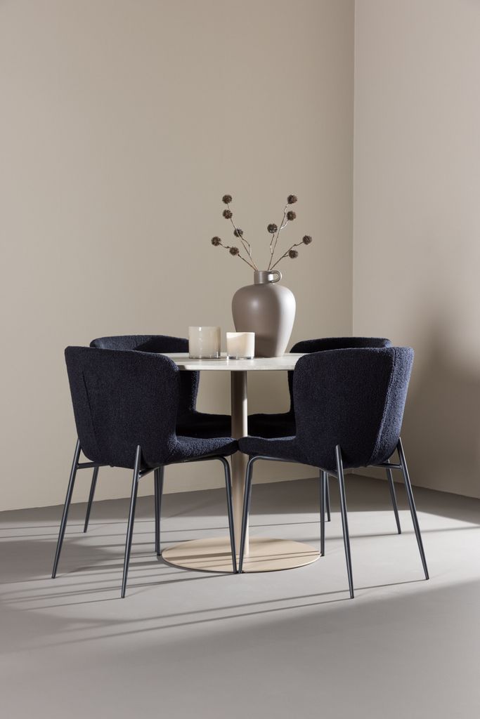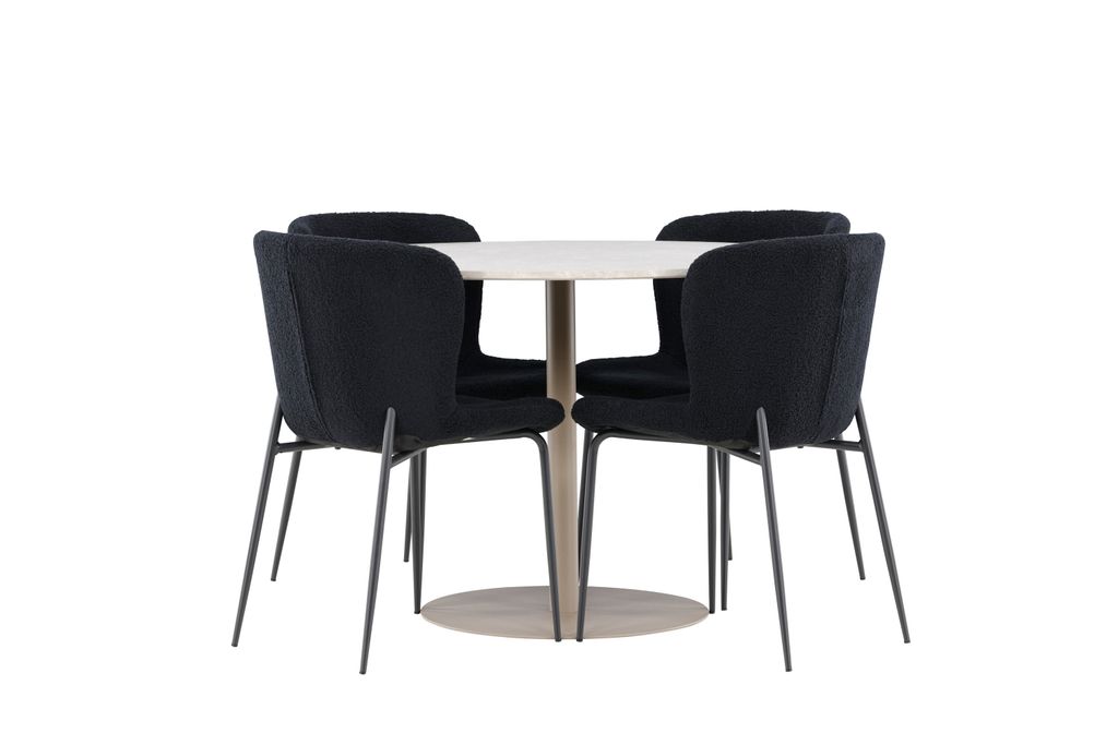 De fyra medföljande Modesto-stolarna är klädda i svart polyester teddy, vilket ger en lyxig och mjuk känsla. Teddy-materialet är känt för sin värme och mjukhet, vilket säkerställer hög komfort under långa middagar. Stolarna har svarta ben som ger stabilitet och förstärker deras moderna design.