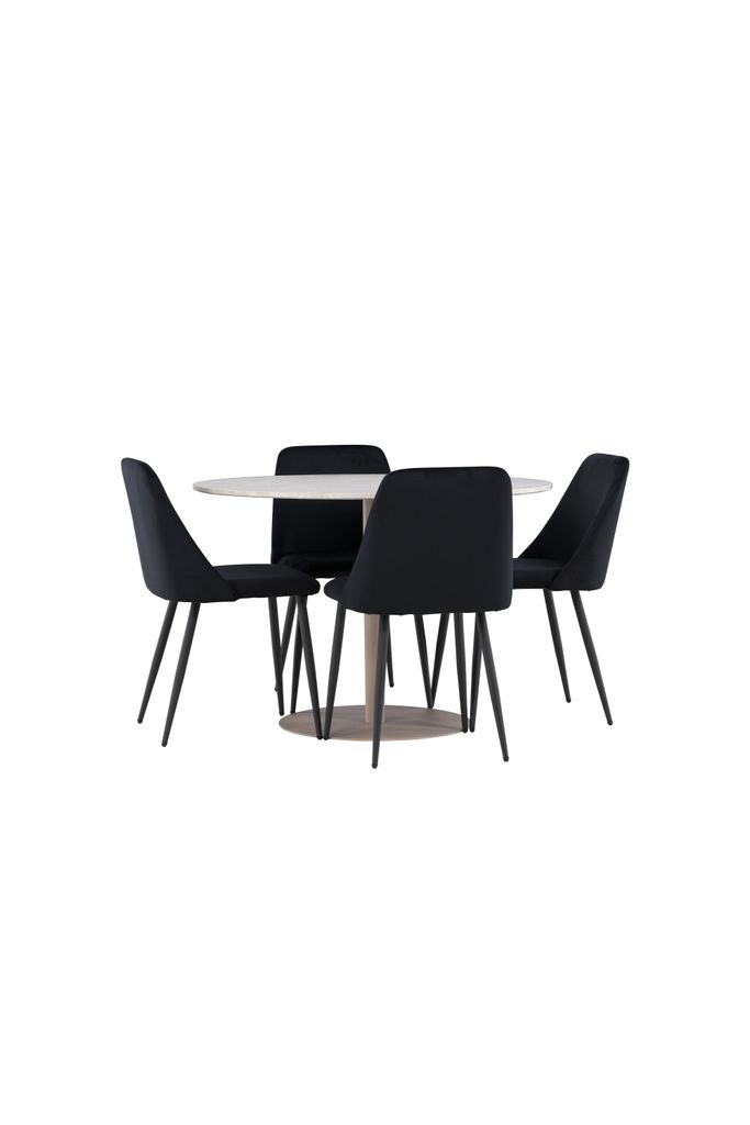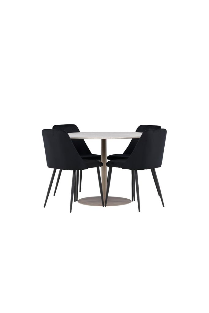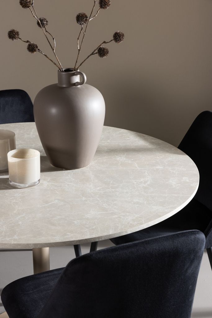De fyra medföljande Night-stolarna kompletterar bordet perfekt. Dessa stolar är klädda i lyxig svart sammet, vilket ger en mjuk och inbjudande sittupplevelse. Sammetstyget är känt för sin elegans och bekvämlighet, vilket gör att du och dina gäster kan sitta bekvämt under långa middagar och samtal. Stolarnas svarta färg skapar en stilfull kontrast mot det beige bordet, vilket ger ditt matrum en modern och sofistikerad atmosfär.