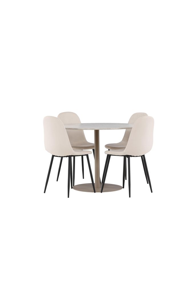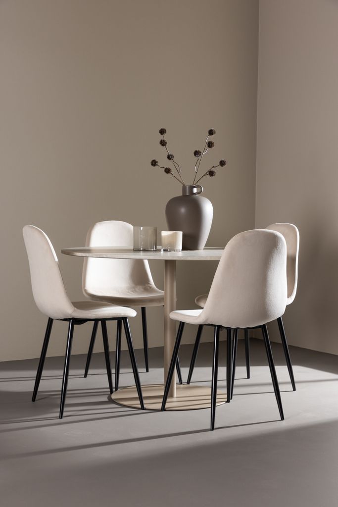 Polar Matstolar kompletterar bordet perfekt med sitt lyxiga beige sammetstyg. Dessa stolar erbjuder inte bara en mjuk och bekväm sittupplevelse, utan bidrar också med en touch av elegans till din matsalsmiljö. De svarta benen ger en stilren kontrast och säkerställer stabilitet och hållbarhet.