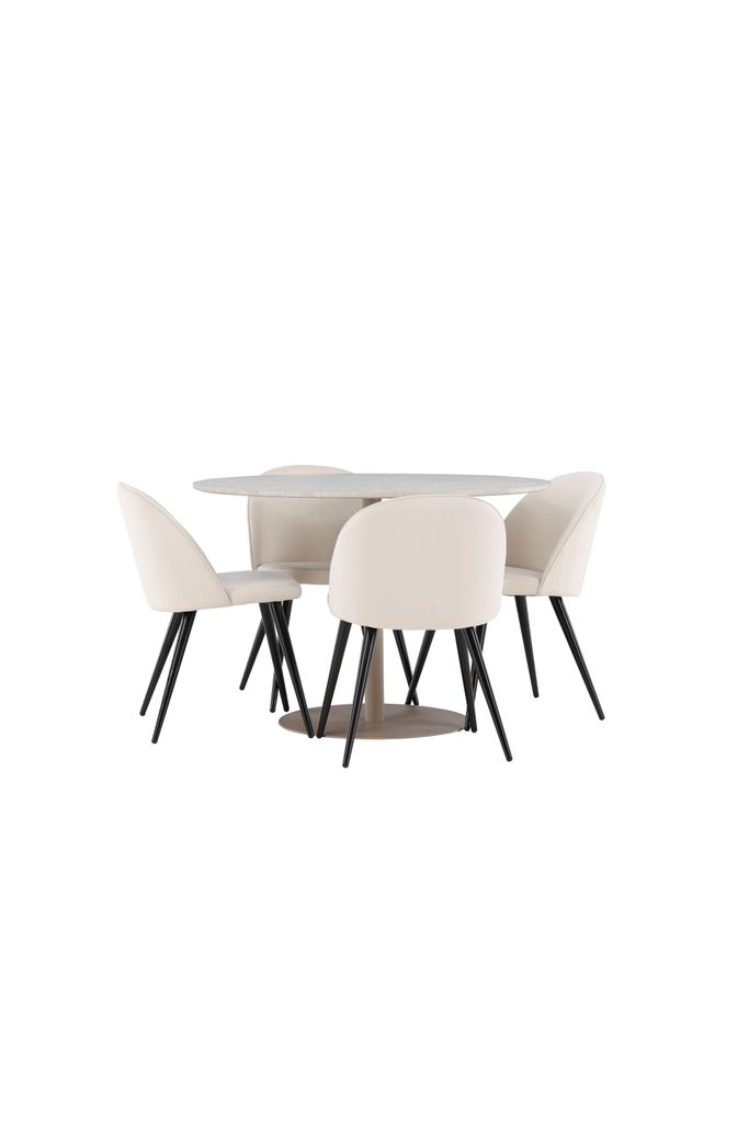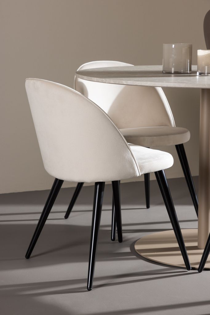 De fyra medföljande Velvet-stolarna kompletterar bordet perfekt. Stolarna har svarta ben som ger en stabil konstruktion, medan sitsen är klädd i mjuk beige sammet för en lyxig och bekväm sittupplevelse. Den stilfulla kontrasten mellan de svarta benen och den beige sitsen skapar en modern och sofistikerad atmosfär.