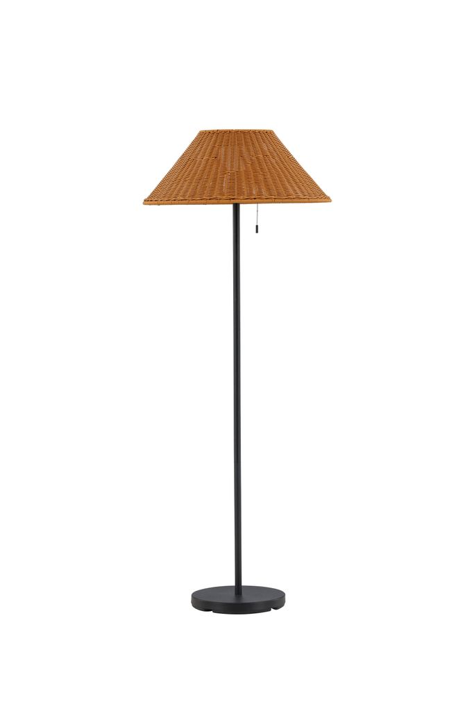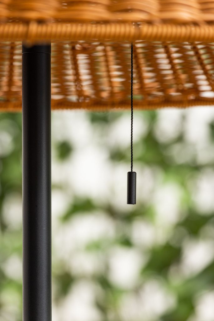 Den flätade skärmen i naturfärger ger ett varmt och inbjudande ljus, vilket skapar en romantisk atmosfär på terrassen, vid poolkanten eller i trädgården. Den stilrena designen gör att lampan smälter in naturligt i din utomhusmiljö samtidigt som den tillför elegans.