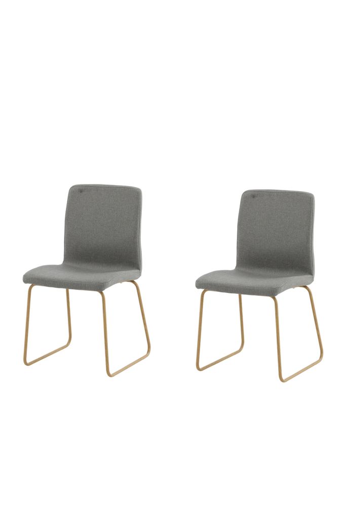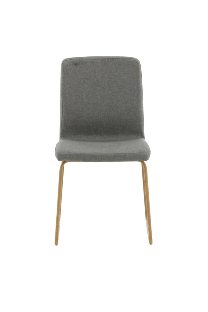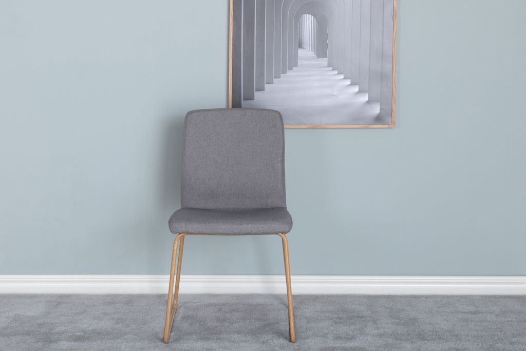 Minimalistisk matstol i ljusgrått tyg med ekfolierade metallben. Perfekt för stilrena middagsstunder.