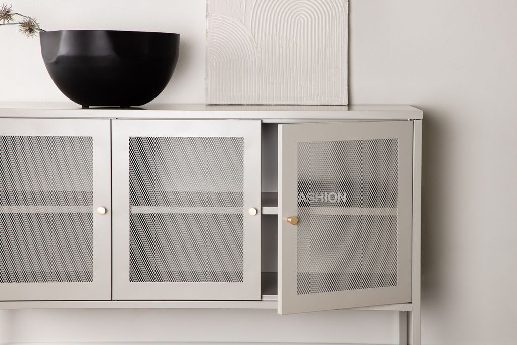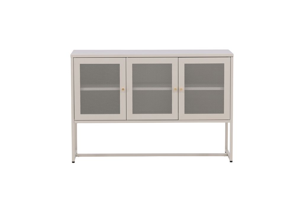Malla - ett modernt skåp i en tuff industriell design med läckra nätdörrar och ben tillverkade i beige pulverlackerad stål med 2 smarta hyllplan för avlastning. Skåpet lyfts upp av smala, höga ben som skapar en luftig känsla och underlättar även för dammsugaren. Den perfekta förvaringsmöbeln för allt du önskar - fyll med porslin, böcker eller vackra dekorationer. Skåpets smidiga storlek och eleganta utsida gör den lättplacerad och passar bra in i de flesta rum i hemmet, så möblera efter egna behov och önskemål!