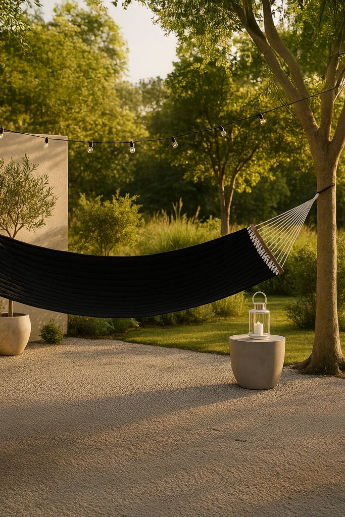 En stilren dubbel-hängmatta i svart polyester med akacia träram och vita rep, perfekt för avkoppling utomhus.