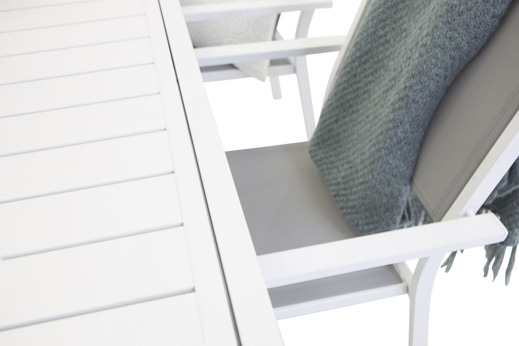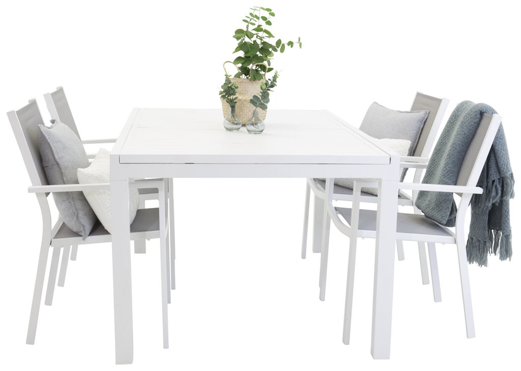 Elegant matgrupp i vit aluminium med stapelbara grå stolar. Förlängbart bord för alla tillfällen.