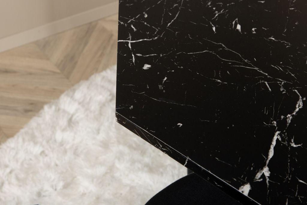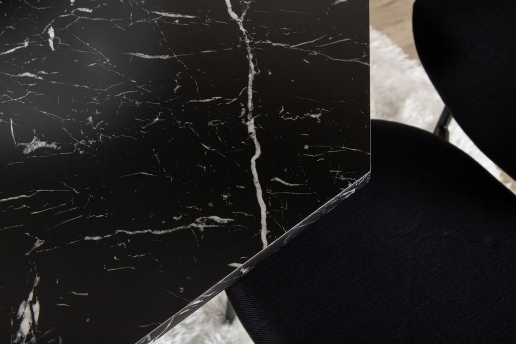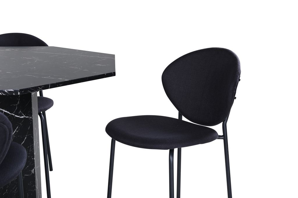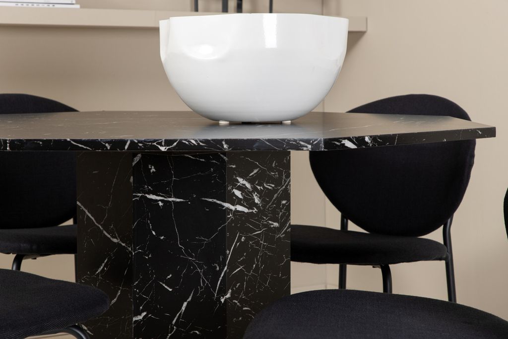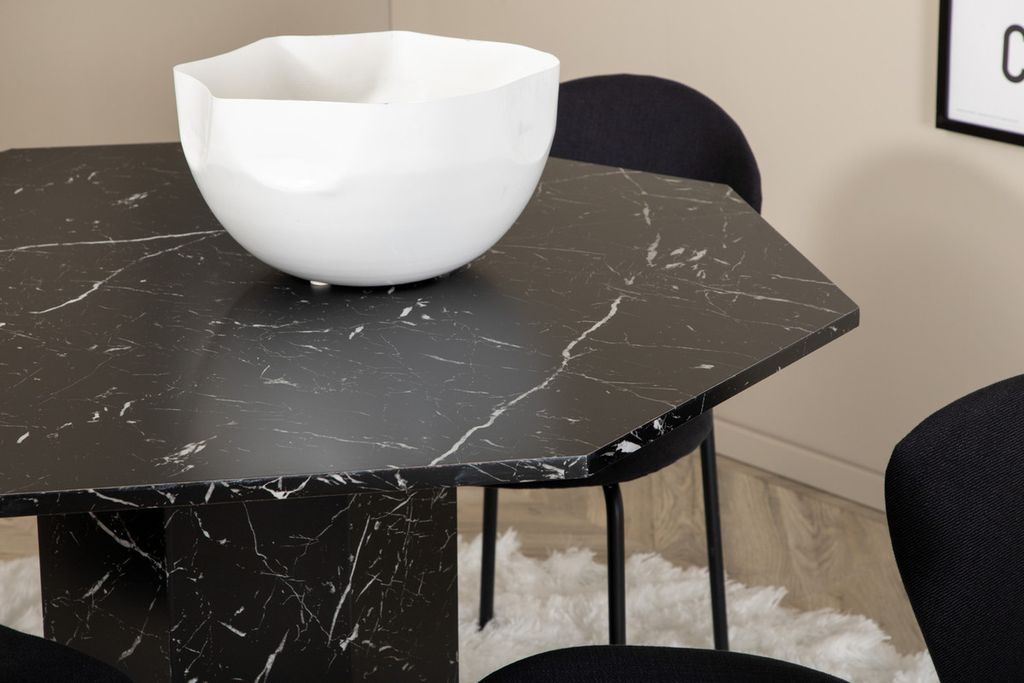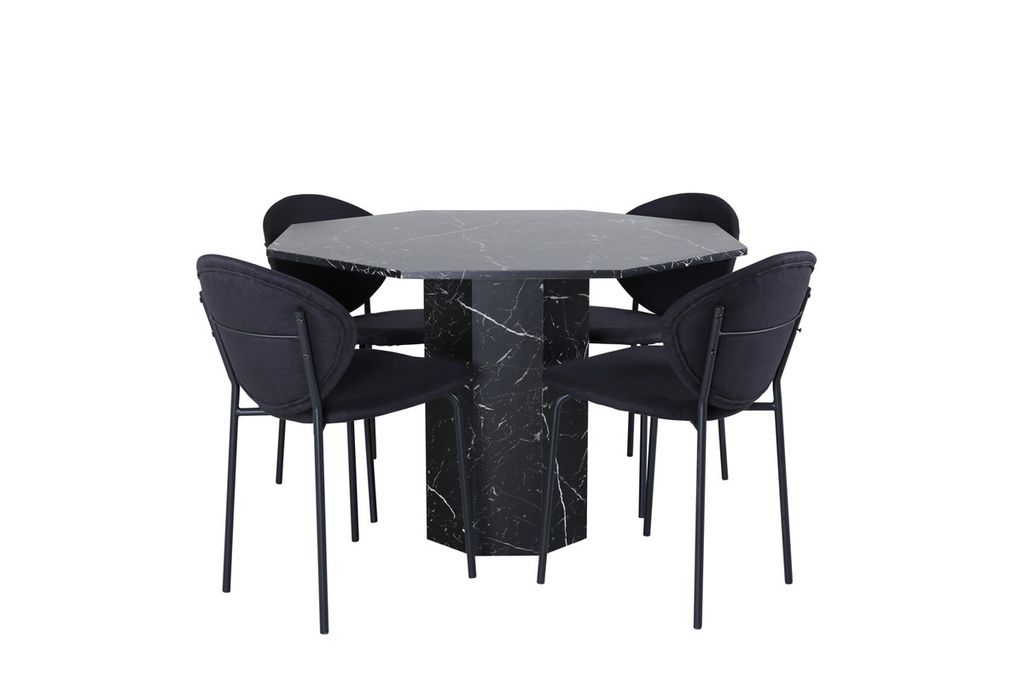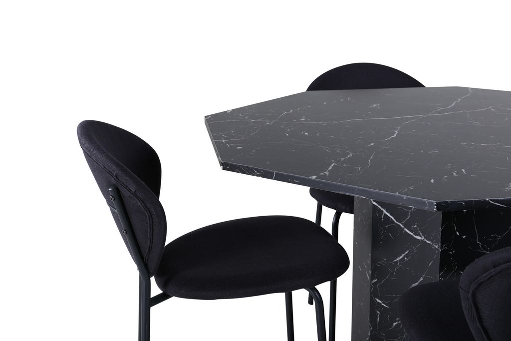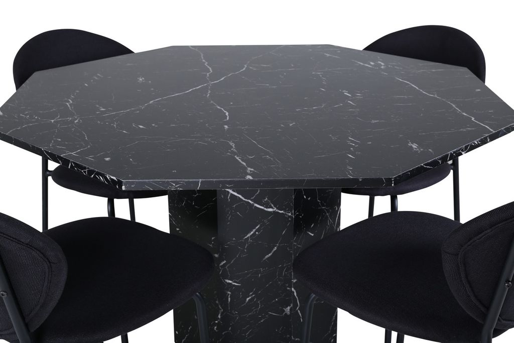 Matbordet Marbs - En stilikon till vardagsrummet! Bordet är format som en oktagon och har en helklädd design med en toppskiva i svart marmorglas med spräckligt vitt mönster och bordsben i MDF och marmorpapper. Bordets mått: Diameter: 110cm, Höjd: 75cm. Här i kombination med 4st Vault matstolar med stolsben i metall och svarta sitsar i polyester. Stolens mått: Höjd: 80cm, Sitthöjd: 49cm, Bredd: 46cm, Djup: 61,5cm. Låt hemmets hjärta prydas av den här iögonfallande matgruppen och njut av långa middagsstunder tillsammans!