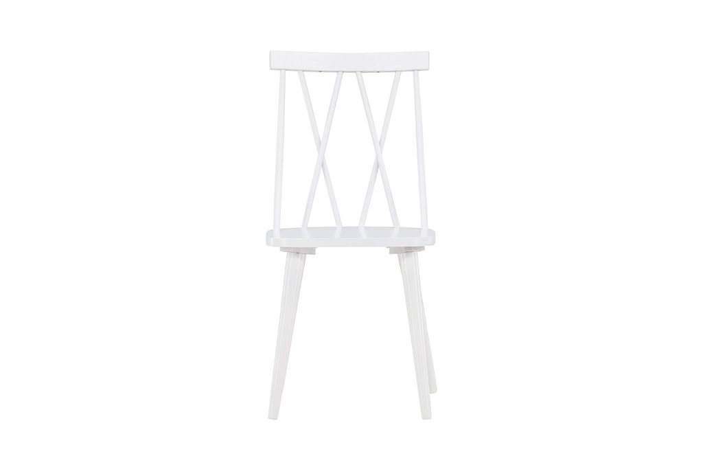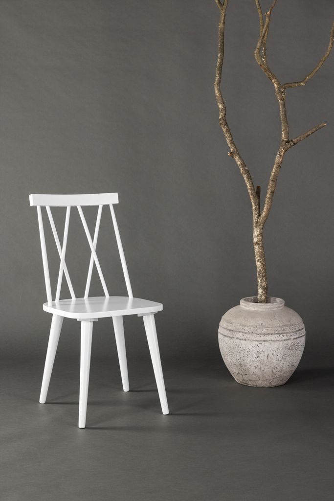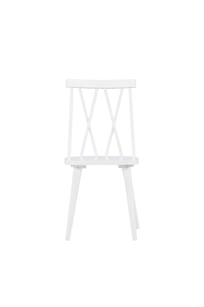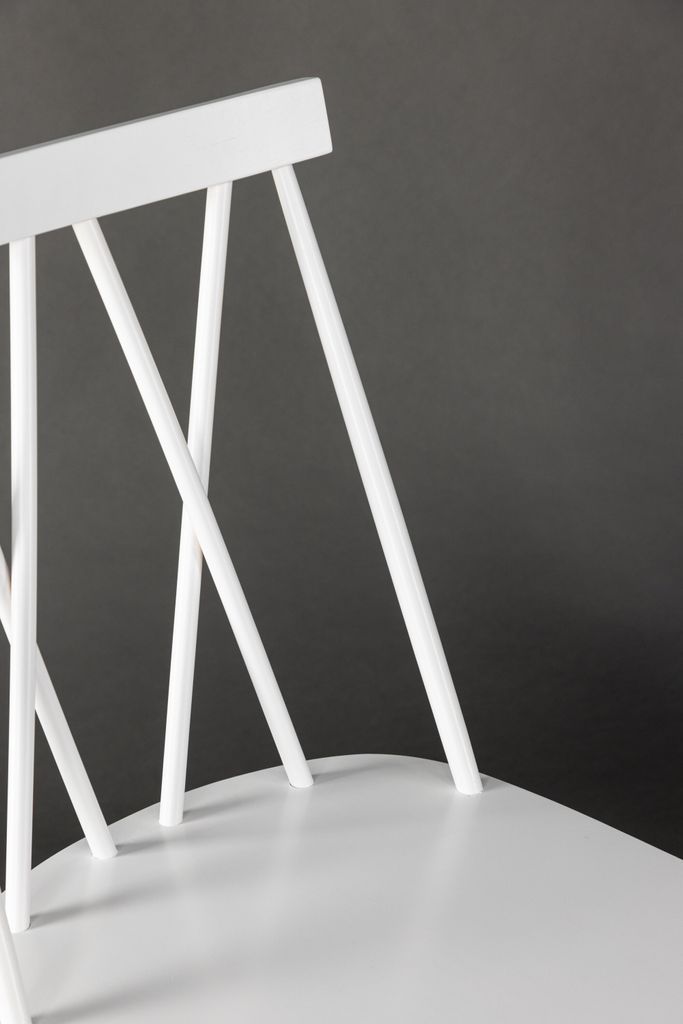 Elegant och hållbar matstol i vitt gummiträ med unik ryggdesign. Perfekt för alla inredningsstilar.