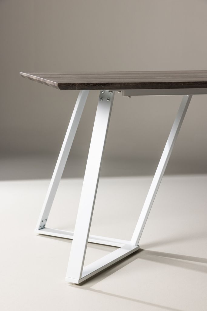 Bordsskivan, tillverkad av högkvalitativ MDF, har en jordnära kulör som vackert kompletterar de vitmålade metallbenen. Denna kombination av material och färg ger bordet en modern och sofistikerad känsla som passar in i de flesta heminredningar. De dekorativa bordsbenen ger inte bara strukturellt stöd utan också en unik design som gör bordet till en visuell höjdpunkt.