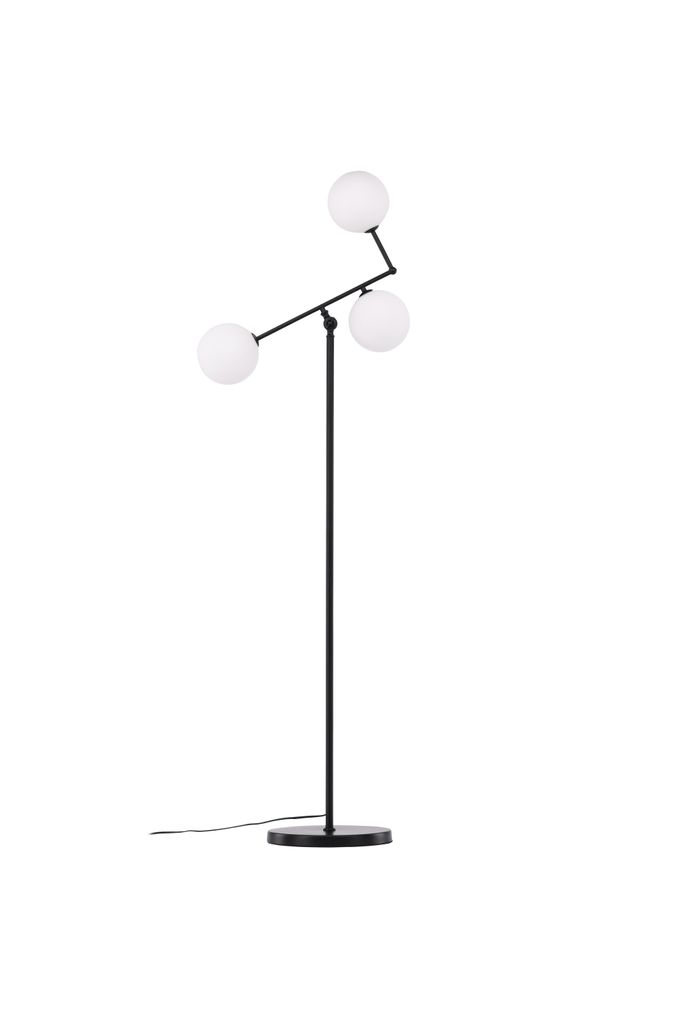 Elegant golvlampa i nordisk design, med svart järnfot och tre vita glaskupor för ett mysigt sken.