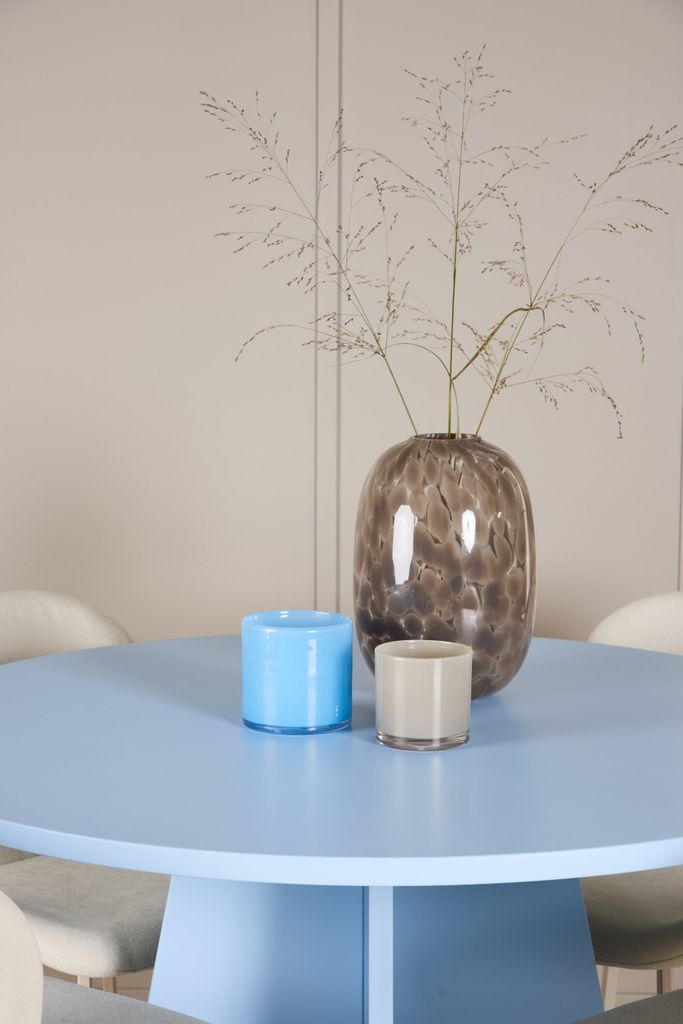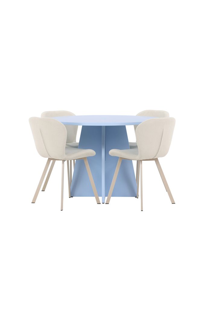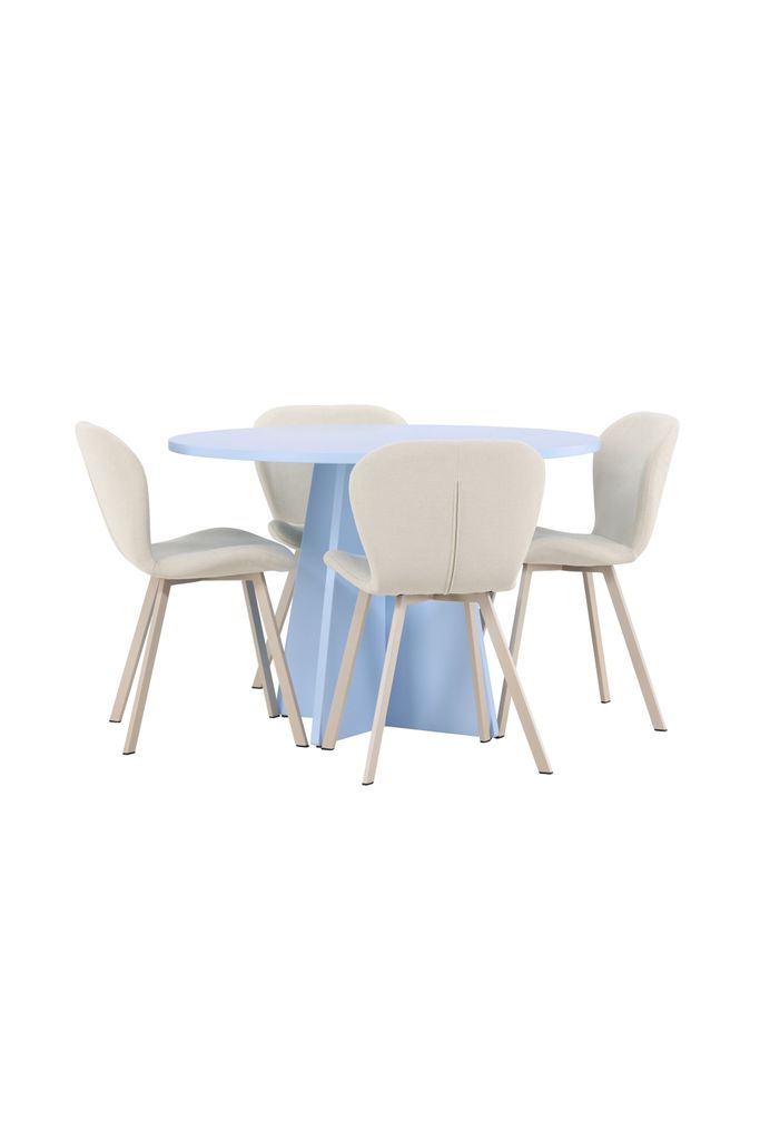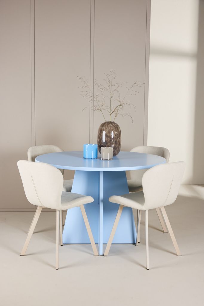 Skapa en stilfull matplats med Bootcut bord i babyblått och Lilja stolar i beige för en harmonisk och elegant atmosfär.