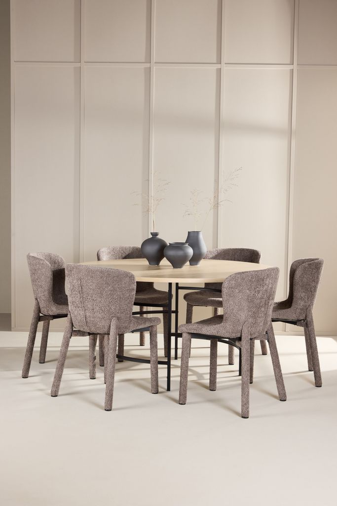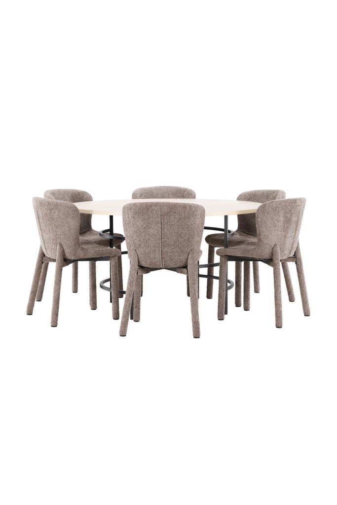 Elegant matgrupp med skandinavisk design, rundat bord i ljust trä och bekväma bruna boucléstolar för en stilfull matupplevelse.