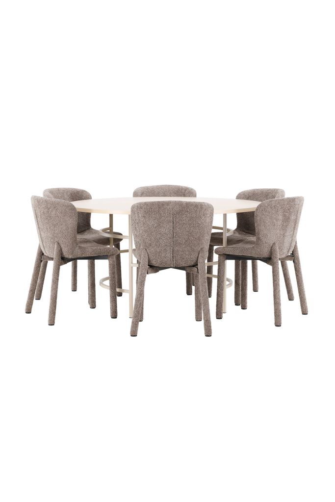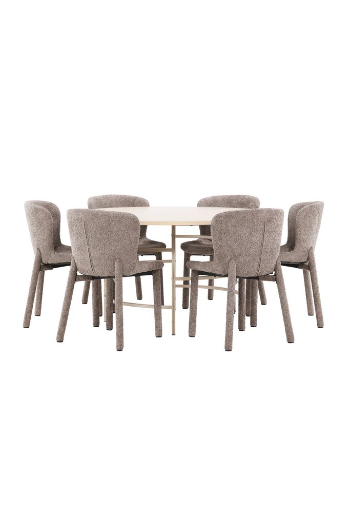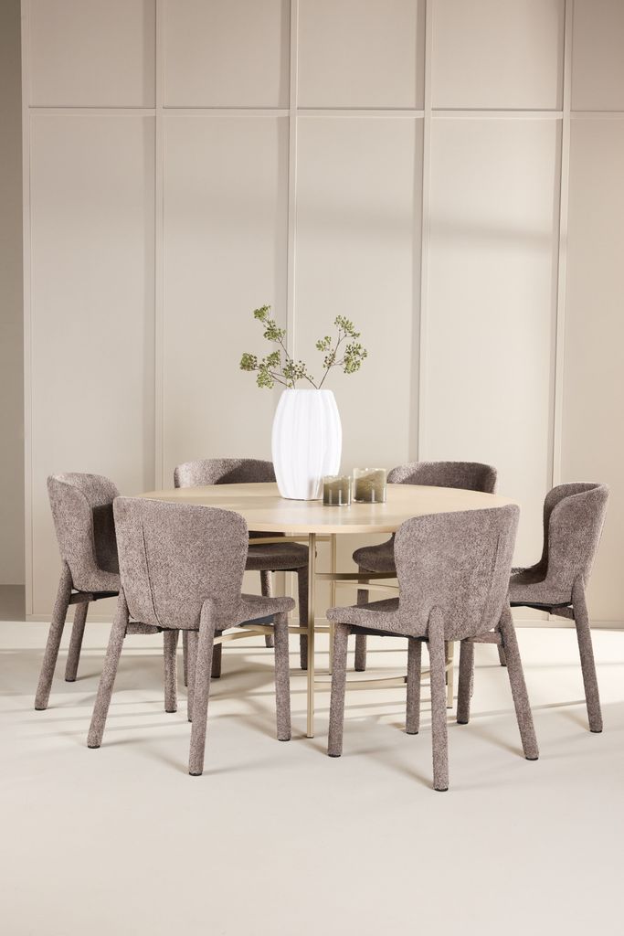 Skapa en elegant matplats med matbordet Copenhagen och de lyxiga Astoria-stolarna i brun bouclé.