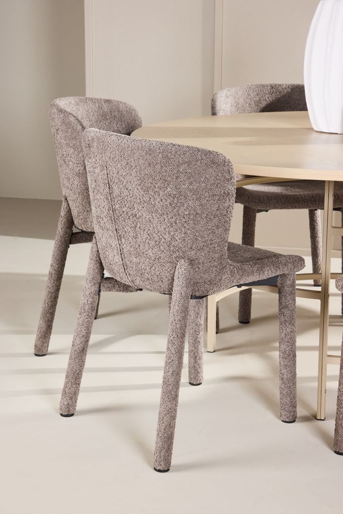 Matstolen Astoria är klädd i en elegant brun bouclé som ger en varm och lyxig känsla. Boucléns mjuka, texturerade yta tillför en dimension av komfort och sofistikering, samtidigt som den rika färgtonen smälter in i både moderna och klassiska inredningsstilar. Med sitt omslutande ryggstöd och generösa sittdyna erbjuder Astoria en oöverträffad sittkomfort, perfekt för långa middagar och trevliga stunder med familj och vänner.