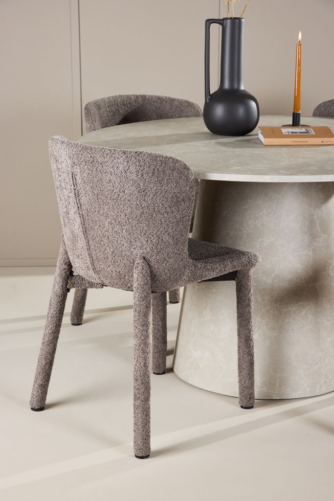 Matchande till bordet är Astoria Stol, klädd i elegant brun bouclé. Stolen erbjuder en varm och inbjudande känsla. Bouclétygets mjuka, texturerade yta ger en dimension av lyx, medan den ergonomiska designen med omslutande ryggstöd och bekväm sittdyna gör den perfekt för långa middagar.